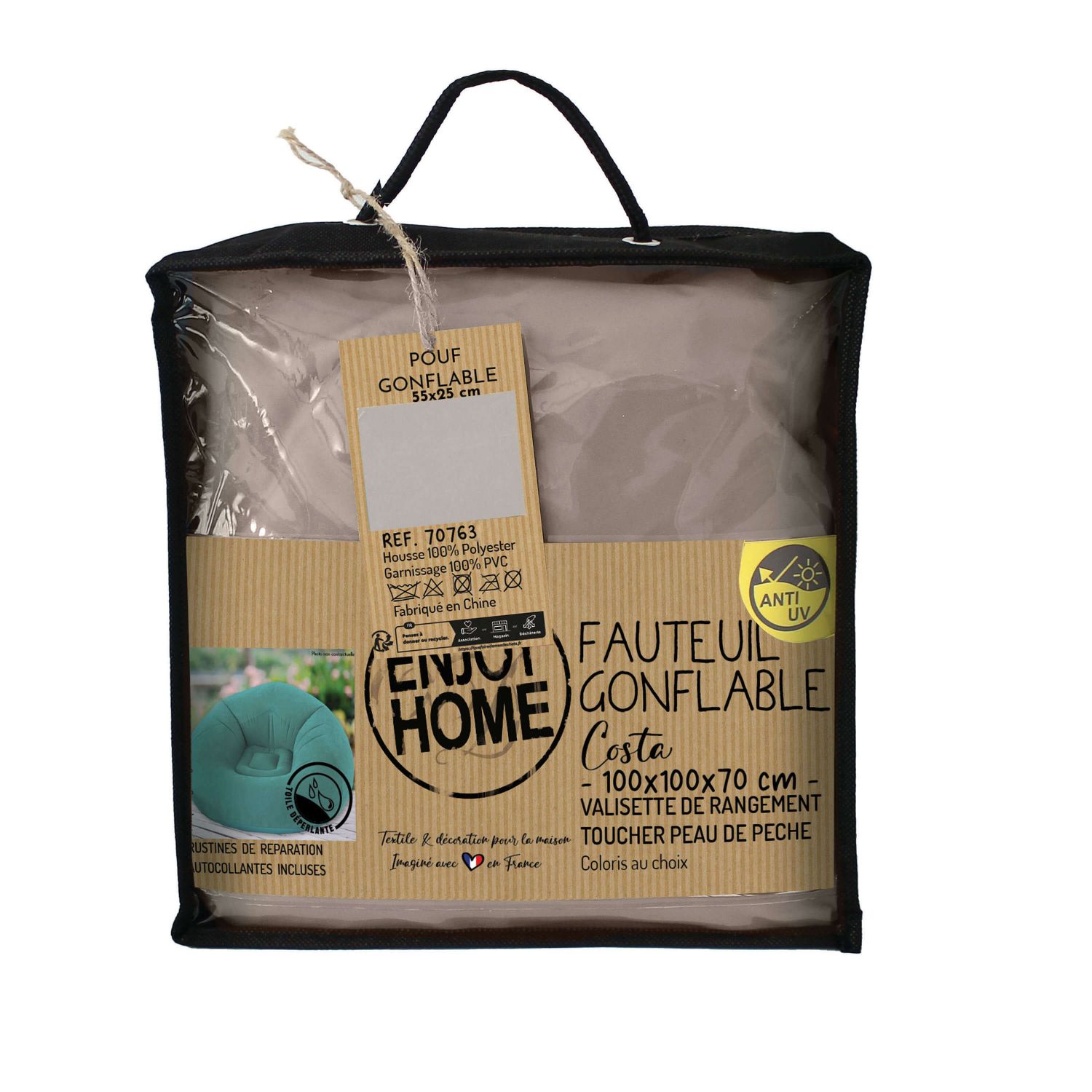 Une valisette pratique pour le rangement et le transportPour faciliter son utilisation et son déplacement, le fauteuil gonflable est livré avec une valisette de rangement. Celle-ci permet d'accueillir le fauteuil lorsqu'il est dégonflé, ainsi que les accessoires fournis tels que les rustines autocollantes. Compacte et légère, cette valisette se transporte aisément à l'aide d'une poignée, permettant ainsi de bénéficier du confort du fauteuil en toutes circonstances.