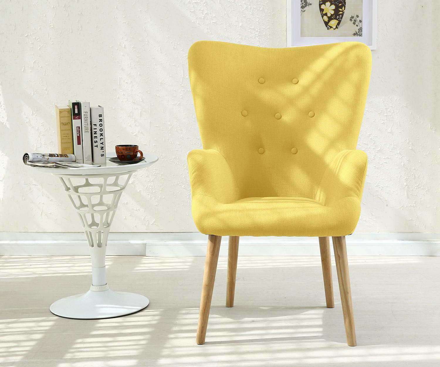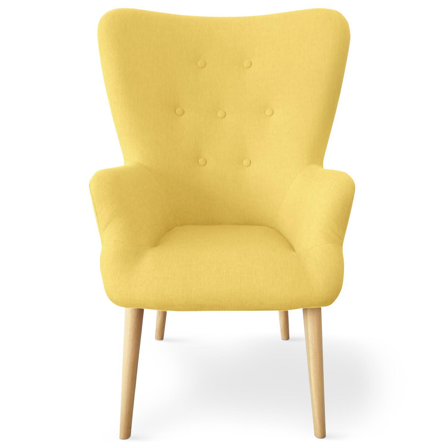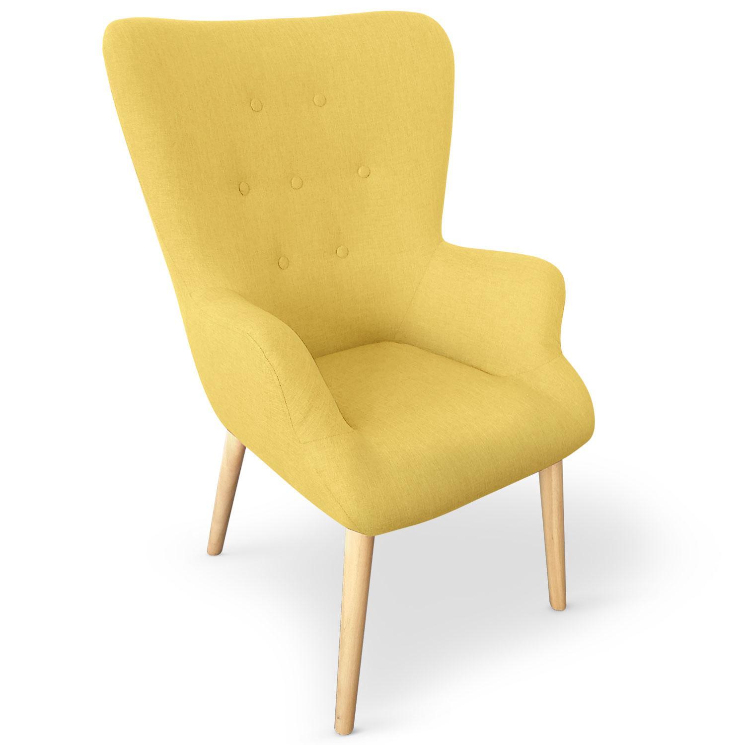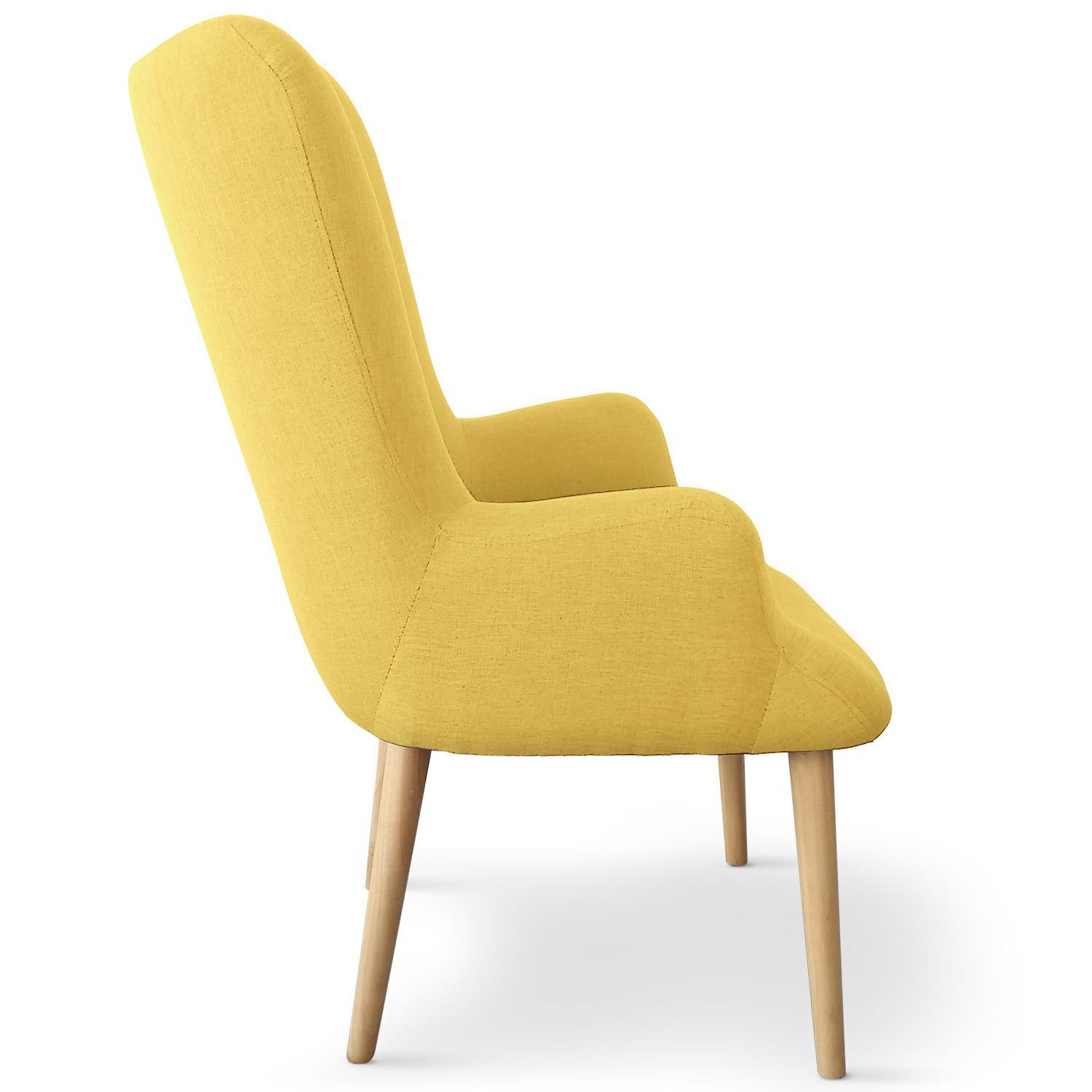 Fauteuil scandinave haut dossier avec revêtement en tissu jaune et pieds en pieds en bois orientés vers l'extérieur de la collection Praira. Ce fauteuil ultra confortable apportera grâce à son haut dossier et ses accoudoirs rembourrés une touche moderne dans votre séjour, chambre ou bureau... L 74 x P 65 x H 104 cm Hauteur d'assise 43 cm