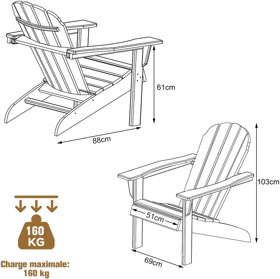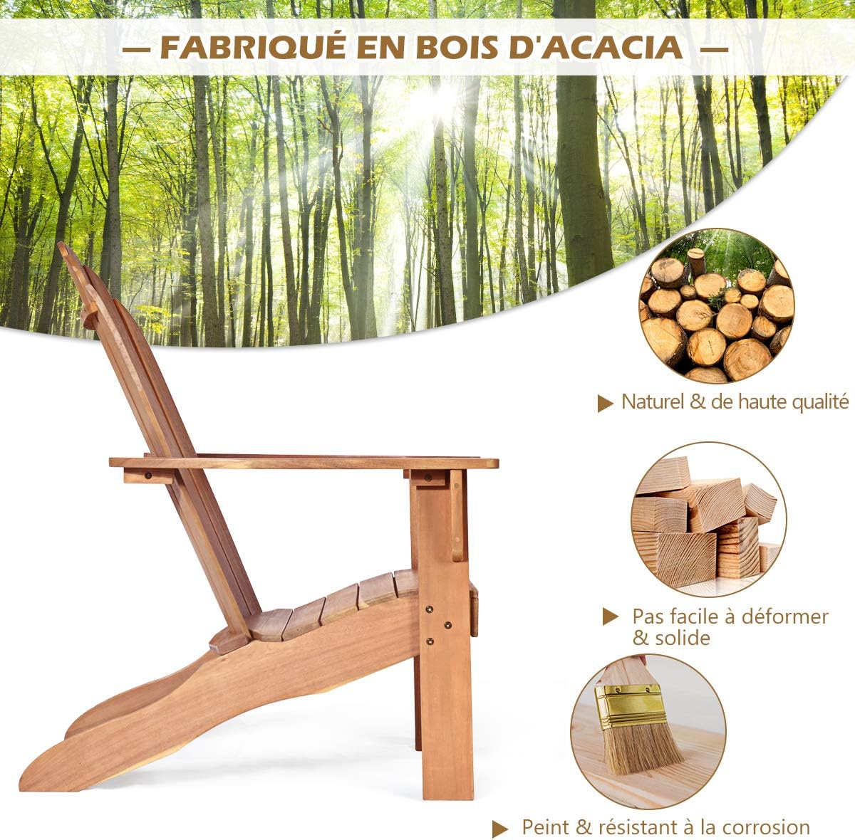- Structure stable : Fabriqué en bois d'acacia très résistant et robuste, notre fauteuil adirondack est conçu pour résister aux intempéries et aux conditions extérieures difficiles. Avec une capacité de charge maximale de 160 kg, ce fauteuil est parfait pour une utilisation en extérieur, offrant un confort durable et une durabilité exceptionnelle.