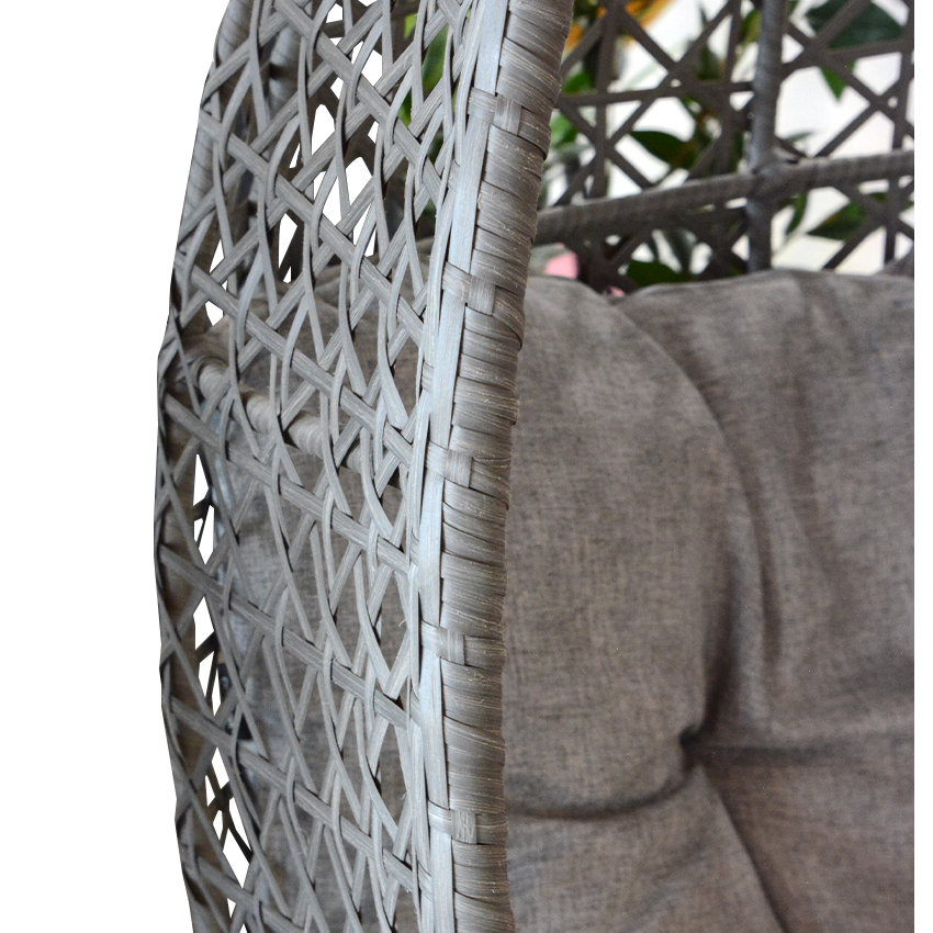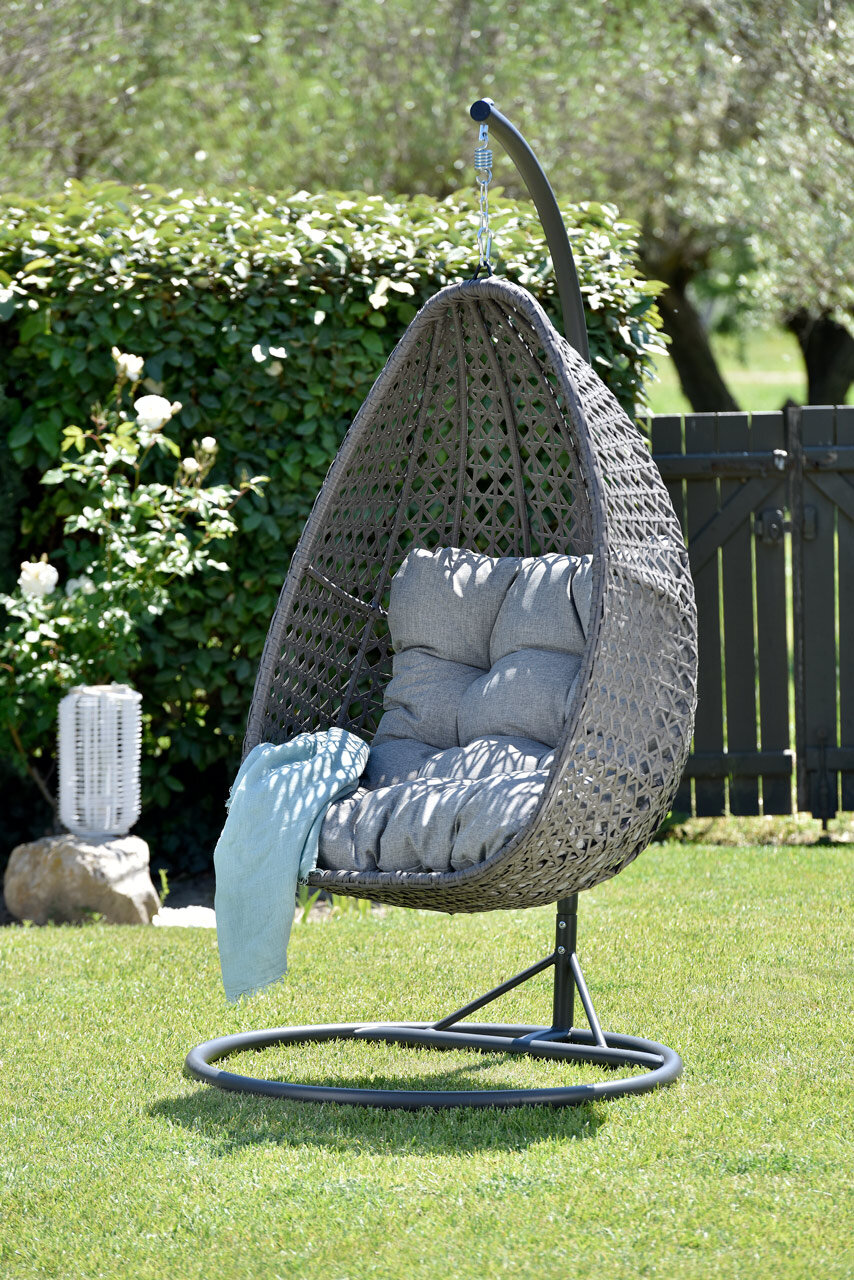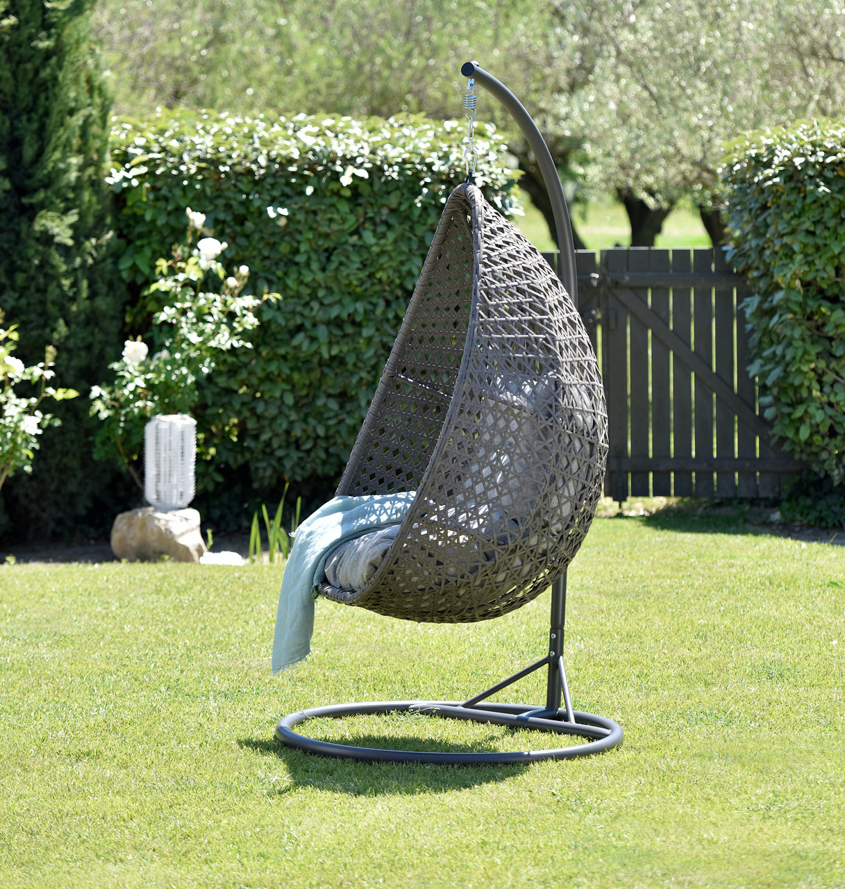 La structure de ce fauteuil est en acier avec une peinture finition époxy gris anthracite. Le revêtement est en résine tressée (imitation rotin), coloris gris avec un tressage fin et élégant. Le coussin, d'une épaisseur de 5cm est en polyester 220g/m2, coloris gris clair. La forme en "goutte d'eau" de l'oeuf confirme l'élégance de ce fauteuil! Structure en acier finition époxy, gris anthracite Résine tressée grise Coussin en polyester 220g/m2, gris clair Dimensions : φ100 x H.190 CM Poids supporté: 110kg Prélassez-vous sur ce fauteuil suspendu robuste, au design tendance et élégant!