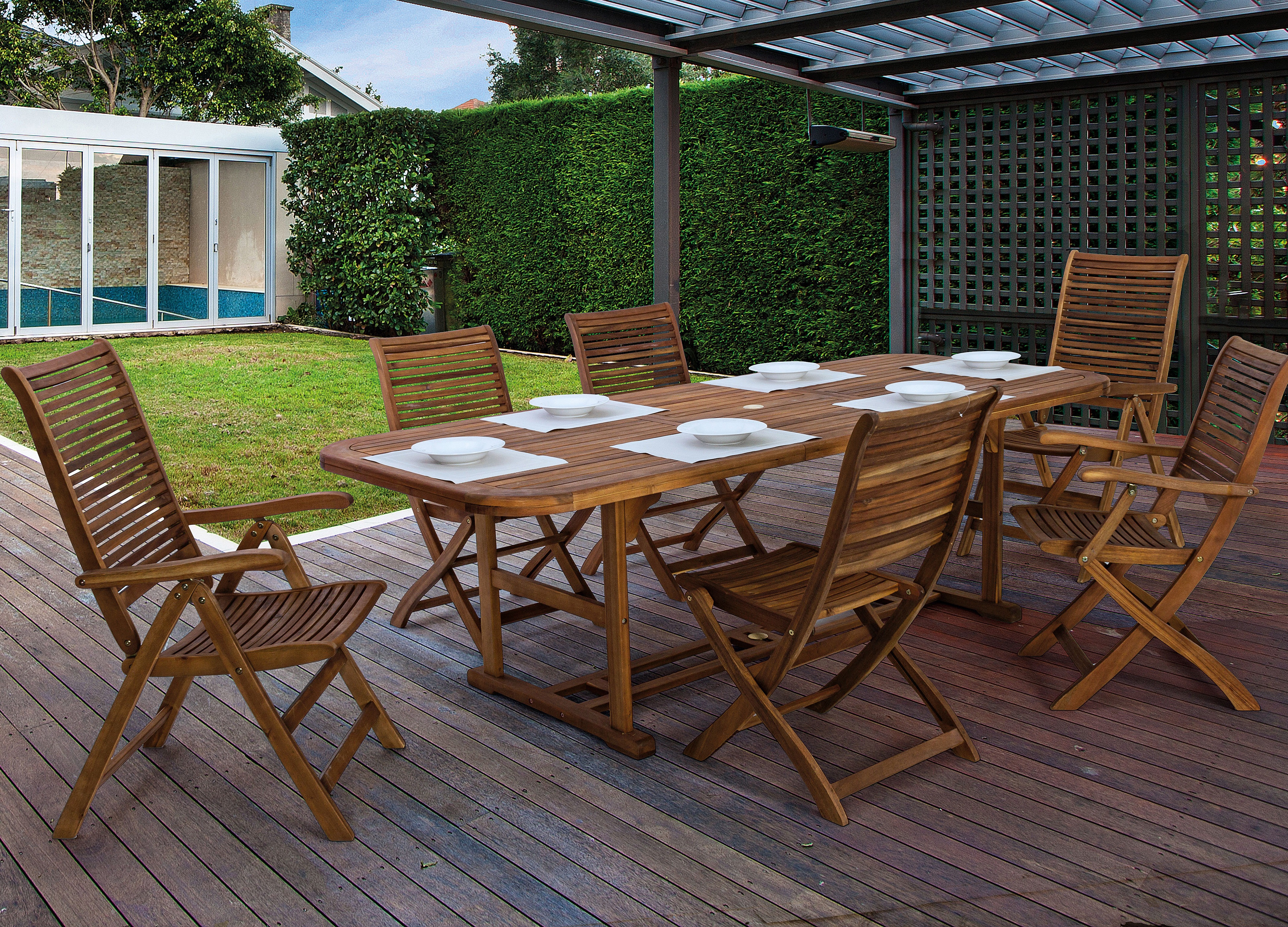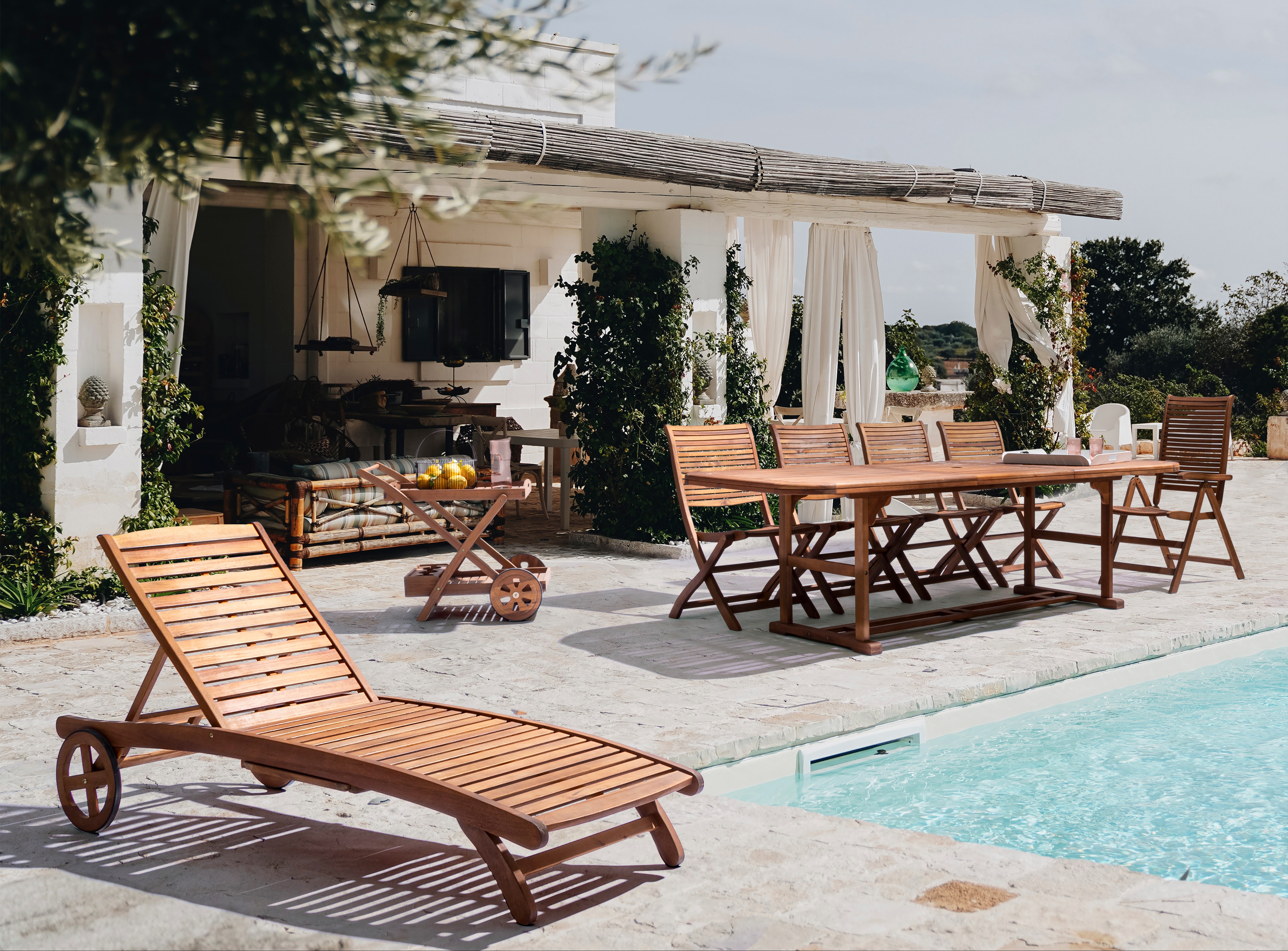 Conseil d’entretien : pour préserver la teinte et la durabilité du bois, appliquez périodiquement une huile adaptée au mobilier d’extérieur.