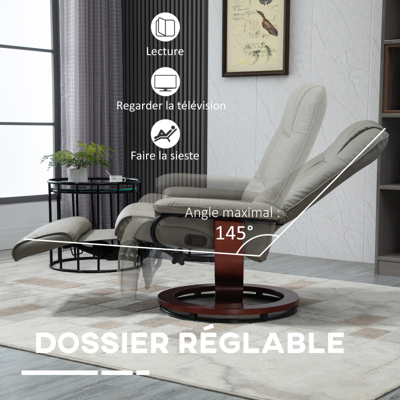Confortable et élégant, le fauteuil relax Caroline de MYCOCOONING va contribuer à vous offrir de paisibles moments de détente. Il pivote à 360 degrés afin de vous orienter comme vous le souhaitez sans avoir à vous lever. Son dossier peut être incliné à 145 degrés et lorsque le repose-pieds est relevé, vous pouvez vous détendre et vous laisser aller à une bonne sieste. L'assise, les accoudoirs et le grand dossier sont rembourrés avec de la mousse haute densité : c'est un siège moelleux et confortable. Le revêtement synthétique du siège et du repose-pieds est agréable et il s'entretient facilement. Le piètement est en bois massif, un gage de robustesse et de stabilité. La charge maximale recommandée sur ce fauteuil majestueux est de 120 kilos. Son design chic et ses matériaux nobles vous permettront de le conserver longtemps. Il va accompagner vos séances de lecture ou de télévision ainsi que vos moments de détente. Caractéristiques : - Fauteuil relax design contemporain mélant sobriété et élégance pour une parfaite intégration à votre intérieur - Chaise inclinable idéale pour se détendre les jambes grâce au repose-pied réglable fourni - Accoudoirs, assise, dossier grand confort rembourrage mousse haute densité (9 cm d'épaisseur au niveau de l'assise) - Inclinaison réglable manuellement jusqu'à 145° : idéal pour s'adapter à toutes situations, lire, regarder la télévision, faire la sieste, etc... - Fauteuil pivotant à 360° afin de vous orienter comme vous le souhaitez - Revêtement fauteuil et repose-pieds en synthétique revêtement synthétique, confort d'utilisation et entretien facile - Pied rond en bois massif résistant pour une stabilité optimale Spécifications : - Couleurs principales : gris - Matériaux principaux : revêtement synthétique, bois massif, rembourrage mousse - Dim. totales : 78L x 87P x 100H cm - Dim. inclinées : 78L x 151P x 89H cm - Dim. assise : 52L x 52P x 45H cm - Dim. dossier : 60L x 69H cm - Hauteur accoudoirs : 53 cm - Charge max. recommandée : 120 Kg