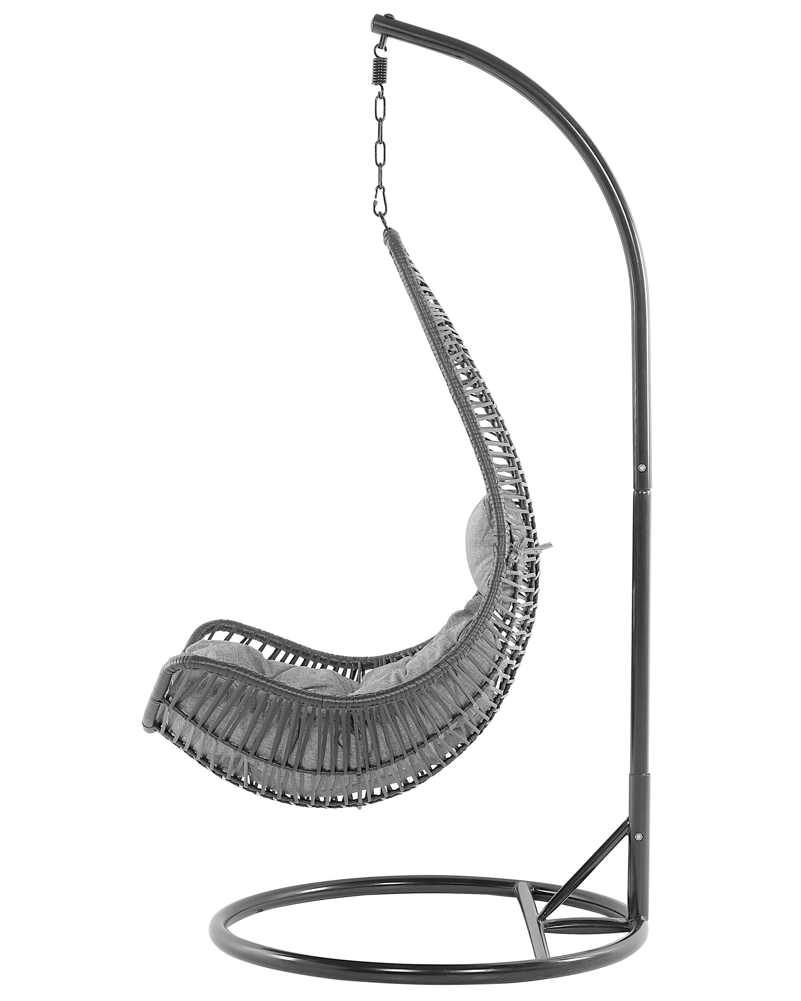 Fauteuil œuf suspendu en polyrotin. Avec son cadre légèrement arqué et sa forme galbée, cette magnifique balancelle vous invite à vous blottir sur son siège en forme d'œuf conçu pour vous apporter un confort absolu. Construite en rotin PE résistant sur un cadre en acier, la nacelle présente un motif de tissage aérien. Avec son support robuste sur un pied rond, vous pouvez être sûr que le siège flottera en toute sécurité. S'harmonisant parfaitement avec tout décor moderne ou bohème, la chaise constitue un fantastique lieu de détente pour une chambre, une véranda ou un salon.