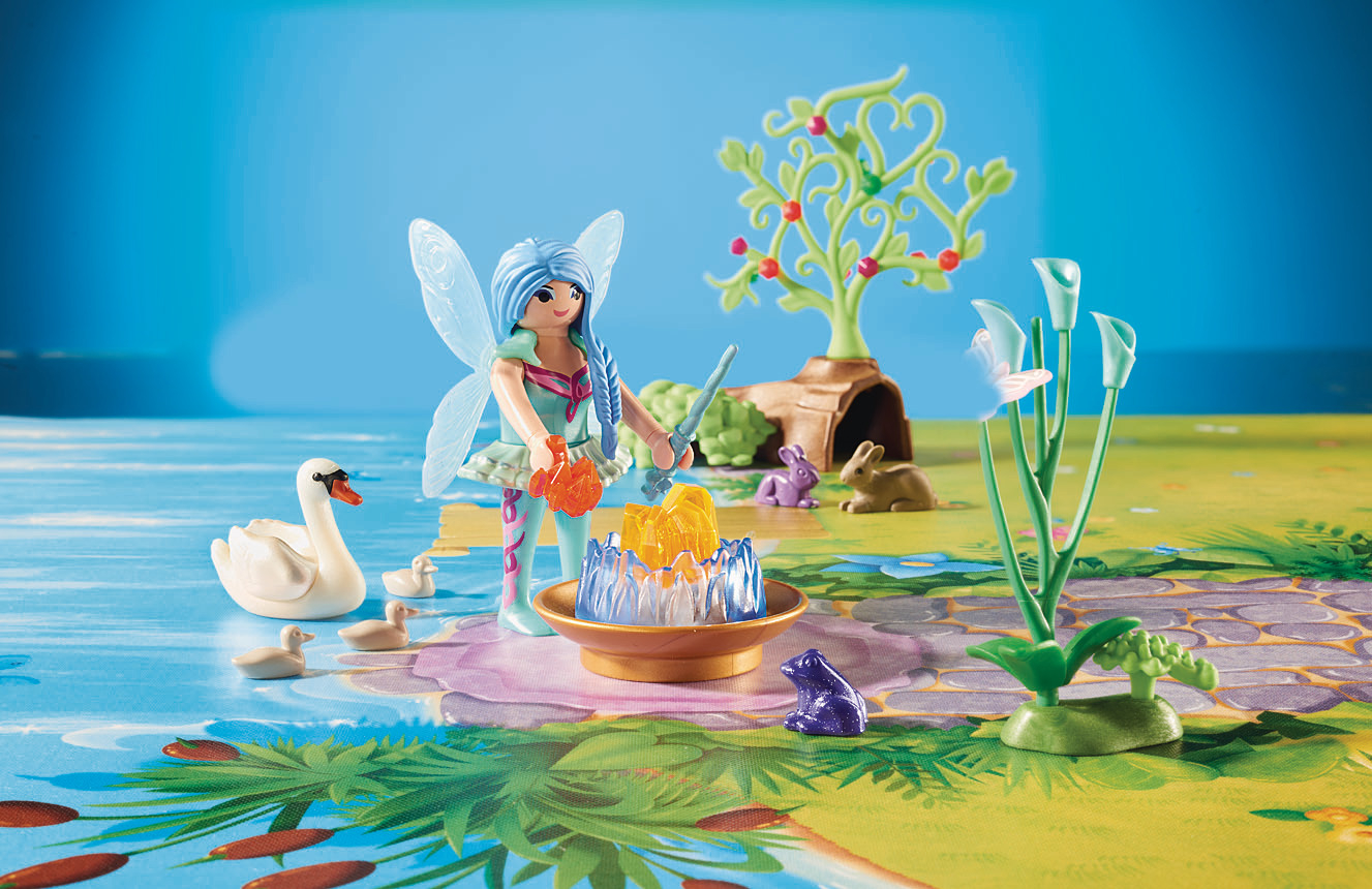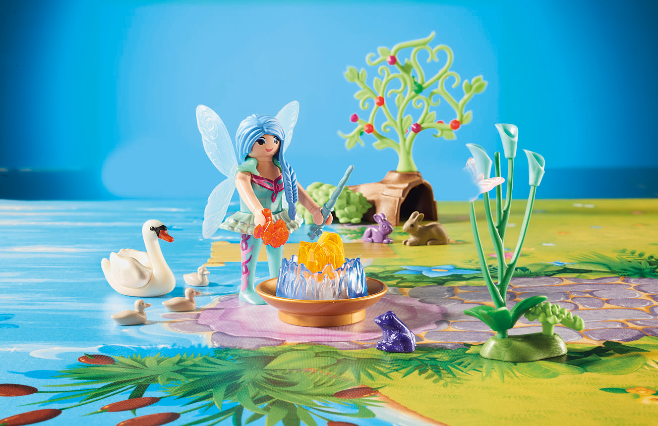 La boîte contient Contient 2 personnages ailées, 1 bateau qui flotte, des animaux (lapins, cygnes, grenouille), des accessoires (végétations, coquillages, bâtons magiques) et un support de jeu avec pince pour le transformer en sacoche à emporter.