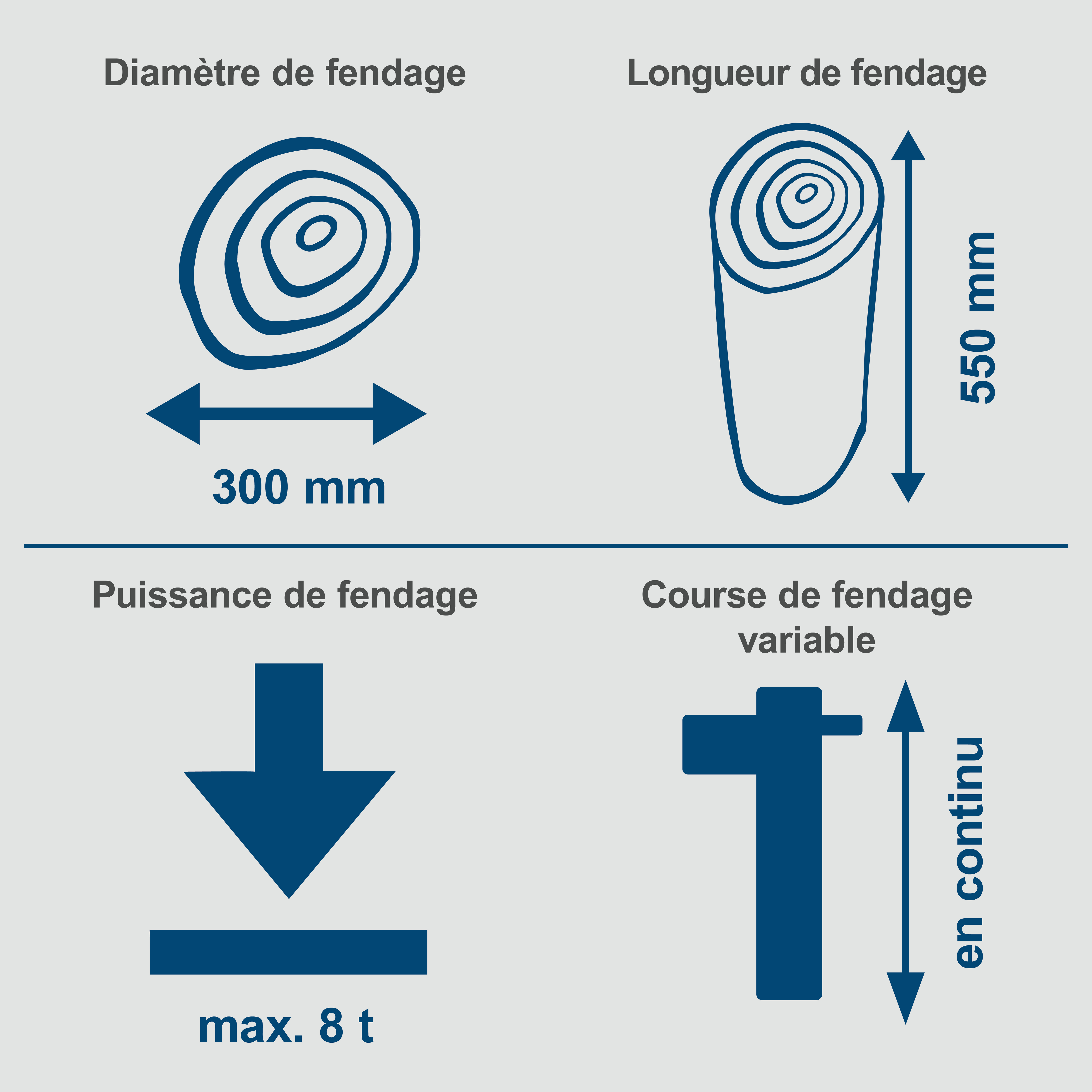 • Puissance de fendage de 8 tonnes • Convient pour le bois dur et le bois tendre • Course de fendage de 550 mm • Equipé de roues de transport permettant un déplacement facile et sûr • Sécurité optimale grâce à une commande bi-manuelle • Bâti en acier résistant à la déformation et revêtu d’une peinture électrostatique • Maintien du bois fendu des deux côtés • Supports pour bois fendu des deux côtés • Réglage variable de la hauteur de fendage