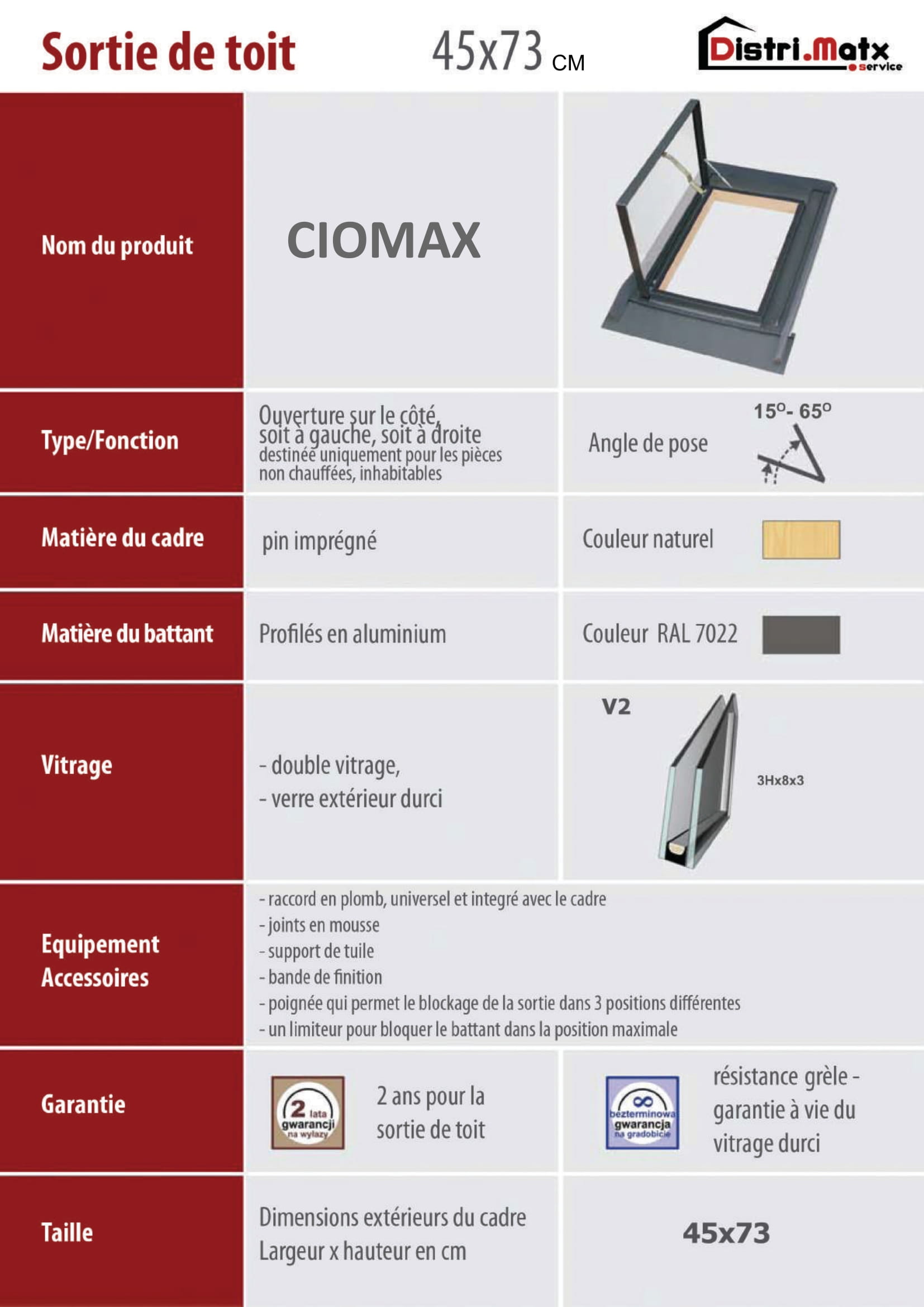La pose de fenêtre de toit est une solution idéale pour l'éclairement des pièces sous toiture et permet également de ventiler occasionnellement les combles. Facile à poser la fenêtre est compatible avec tous modèles de tuile. Ces fenêtres ne sont pas recommandées dans les pièces habitables à cause de leur performance thermique. Le cadre en bois de pin et l'ouvrant double vitrage d'une épaisseur de 15 mm (3x8x3mm) est intégrés dans le profilé d'aluminium (verre extérieur durci). La fenêtre possède une jupe plomb collée à la base, il se maroufle facilement pour s’adapter au profil de la toiture. S’utilise sur une pente de toit allant de 15° à 65°. Ouverture soit à droite soit à gauche. La poignée permet le blocage de l’ouverture dans 3 positions différente. La fenêtre possède un limiteur pour bloquer le battant dans la position maximale • Matière du battant : profilés en aluminium couleur gris terre d’ombre (RAL 7016), jupe en plomb. • Matière du cadre : pin imprégné couleur naturel. • Verre extérieur durci, Double vitrage 3Hx8x3. • Dimension extérieure du cadre : 45 cm x 73 cm. Angle de pose de 15° à 65°. • S’adapte à toutes les tuiles et est livrée avec un raccord d'étanchéité. Facile à poser.
