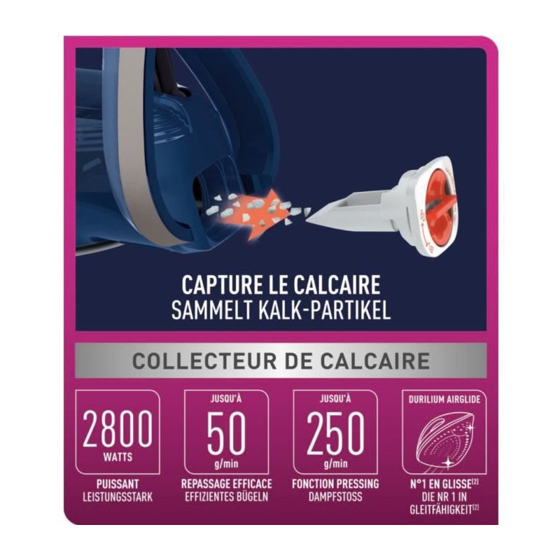 fv6830c0 - fer à repasser vapeur 2800w 50g/mn - Doté de nombreuses fonctions, le fer à repasser vapeur Ultragliss Anti Calc Plus FV6830C0 de Calor assure des résultats parfaits en toute simplicité, une qualité de glisse incomparable et une performance de vapeur durable dans le temps. Ce fer à repasser haute performance est équipé d?une puissance de 2800 W pour un temps de chauffe rapide. Il dispose d?un collecteur de calcaire amovible exclusif pour faciliter l?entretien et assurer des performances durables.Des performances durables dans le temps :Le collecteur de calcaire amovible exclusif offre un entretien et un nettoyage sans effort pour des performances de repassage conçues pour durer.2 800 W pour un temps de chauffe rapide :Parfaitement adapté à vos besoins quotidiens, ce fer à repasser d'une puissance de 2 800 W garantit un temps de chauffe rapide, pour des résultats irréprochables à tout moment.Résultats efficaces :Débit de vapeur continu de 50 g/min maximum. Pour des séances de repassage simples et des résultats parfaits en un rien de temps.Une fonction pressing ultra-puissante :Une fonction pressing très puissante de 250 g/min qui permet de venir à bout de tous les plis, même les plus tenaces.Diffusion optimale de la vapeur :Ouvertures de sortie de vapeur 100 % actives avec 30 % d'ouvertures en plus par rapport à la génération Ultragliss précédente pour une efficacité optimale et des résultats parfaits.Semelle de qualité :Numéro 1 de la glisse par Calor et conçue pour durer, la nouvelle semelle Durilium Airglide garantit des performances exceptionnelles et une diffusion optimale de la vapeur grâce à sa technologie brevetée.Mode éco :Faites des économies d'énergie grâce au mode éco qui utilise 20 % moins d'énergie, pour une performance respectueuse de l'environnement et des factures d'électricité moins élevées.Pointe précision pour un repassage pratique :La pointe du fer a été spécialement conçue pour faciliter le repassage autour des boutons.Défroissage vapeur vertical facilité :Un défroissage d'une grande variété des vêtements y compris tissus délicats est possible grâce à la fonction de défroissage vertical. Cette fonction est idéale pour éliminer les plis des costumes, robes, jupes, t-shirts...ou même les rideaux.Des performances longue durée :Les performances longue durée sont à portée de main avec ce fer à repasser vapeur de qualité conçu pour durer et sa semelle anti-rayures résistante.