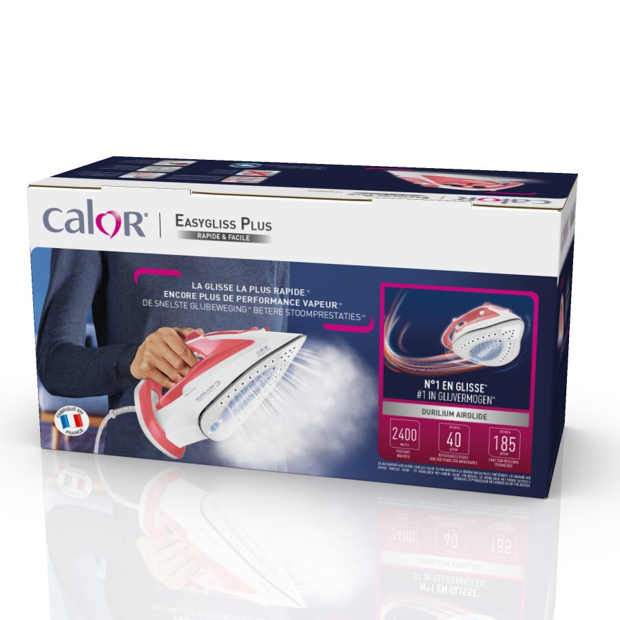 Le fer à repasser Easygliss Plus est équipé d'une semelle dotée de la technologie Durilium Airglide de Calor qui garantit une glisse parfaite et une plus grande puissance de vapeur, pour simplifier et raccourcir vos sessions de repassage. Sa puissance de 2 400 W offre un temps de chauffe rapide associé à un débit de vapeur continu de 40 g/minute pour des résultats rapides et à un jet de vapeur ultra-puissant de 185 g/minute pour venir à bout des plis les plus tenaces. Puissance de 2 400 W pour un temps de chauffe rapide Un débit de vapeur continu jusqu'à 40 g/minute permet de raccourcir les sessions de repassage avec une efficacité optimale, pour des performances optimales. Un jet de vapeur extrêmement puissant de 185 g/minute élimine facilement les plis des tissus épais et les plis tenaces. Les trous de la semelle sont 100 % actifs pour une diffusion optimale de la vapeur et des sessions de repassage plus simples et à l'efficacité inégalée. Le système de vapeur automatique garantit une simplicité inégalée en vous permettant de régler la combinaison de vapeur/température adaptée grâce à un bouton