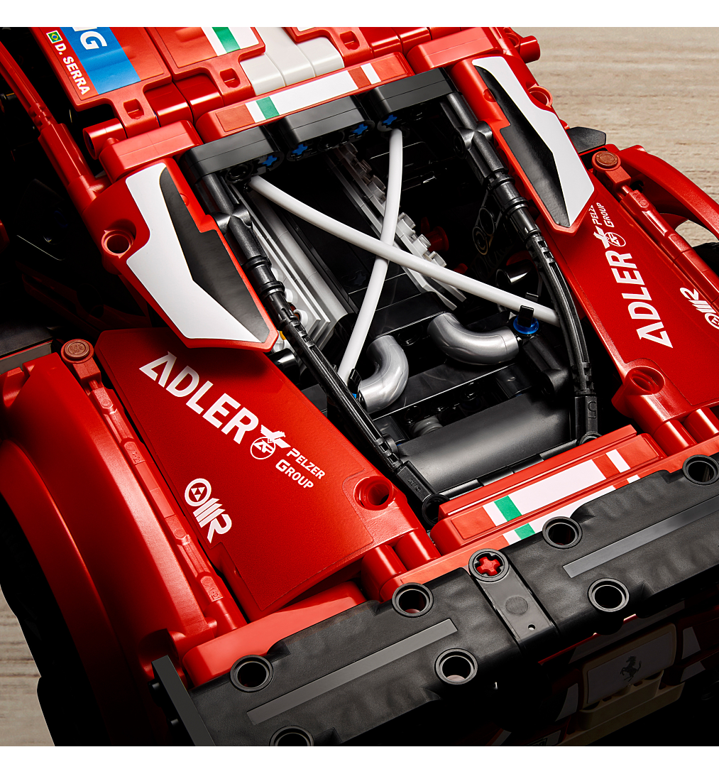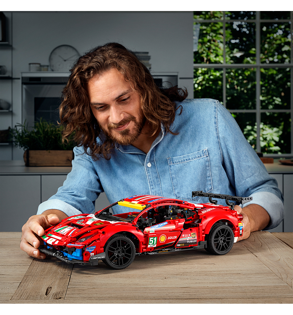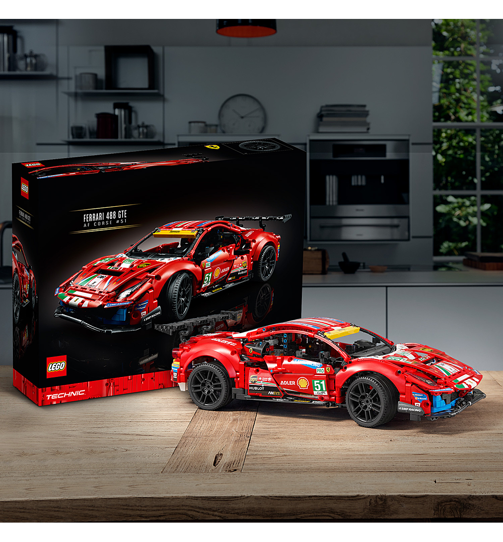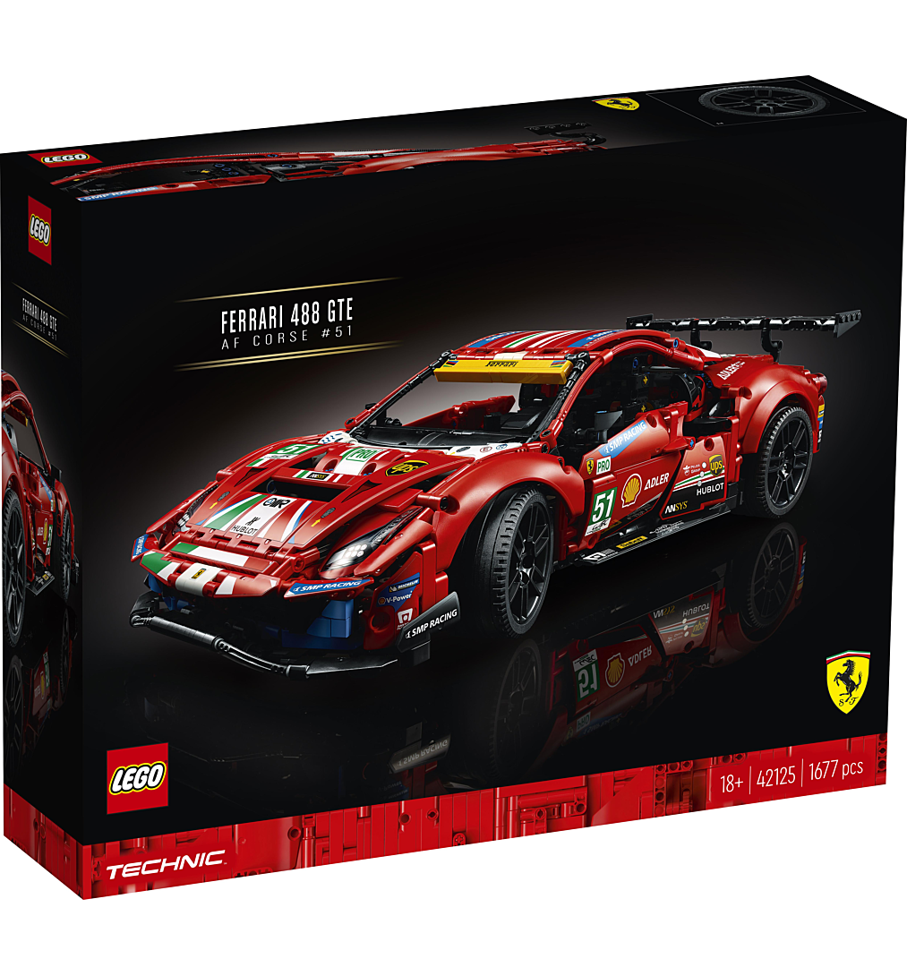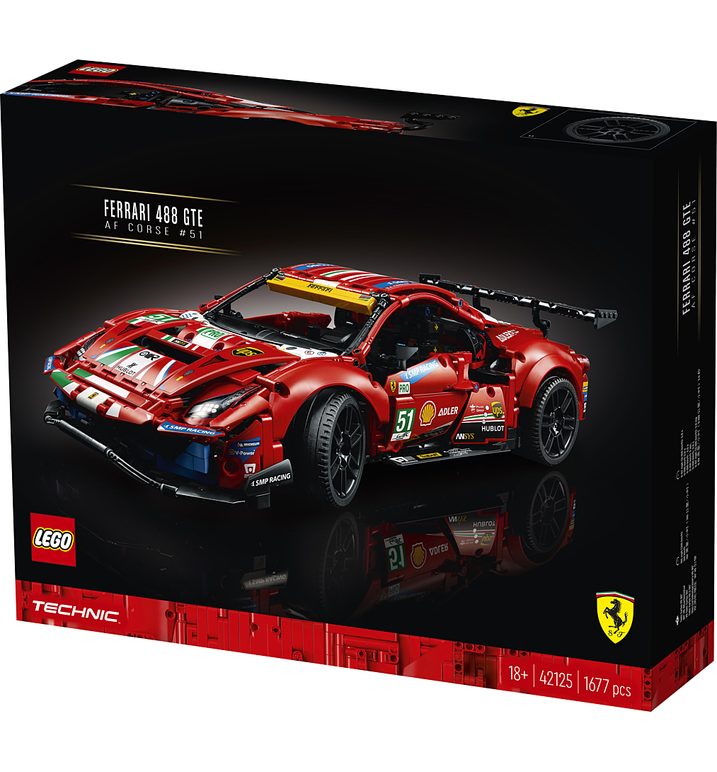 La boîte contient • Les passionnés vont plonger dans le monde fascinant de la course d’endurance LEGO® Technic et créer leur propre modèle à exposer de la Ferrari 488 GTE.• Les fonctions authentiques incluent des suspensions avant et arrière, des portes qui s’ouvrent, un moteur V8 avec pistons mobiles et un volant qui fonctionne.• Avec des autocollants de course et des couleurs fidèles à l’original, la LEGO® Technic Ferrari 488 GTE « AF Corse #51 » (42125) occupera une place d’honneur dans la maison ou le bureau de tout fan de sports mécaniques.• Projet de construction gratifiant pour adultes, cadeau inspiré à offrir pour un anniversaire ou une occasion spéciale à tous les passionnés de course d’endurance, de Ferrari et de sports mécaniques.• Le modèle mesure plus de 13 cm de haut, 48 cm de long et 21 cm de large.• Le capot et les portes s’ouvrent, permettant de découvrir les nombreux détails à l’intérieur.• Ce set s’accompagne d’un livret d’instructions spécial au contenu exclusif, dont des détails sur la voiture et l’équipe AF Corse 51.• Les sets LEGO® Technic, avec leurs designs élégants et leurs fonctions réalistes, proposent une expérience de construction enrichissante et des modèles aux caractéristiques impressionnantes pour toute personne passionnée d’ingénierie et de technologie.• Les éléments LEGO® Technic sont conformes aux normes industrielles les plus strictes ; ils sont compatibles entre eux, s’assemblent et se séparent parfaitement, et cela depuis 1958.• Les éléments LEGO® Technic sont soumis à des tests de chute, de chaleur, d’écrasement et de torsion, puis analysés afin de s’assurer qu’ils sont conformes aux normes de sécurité les plus élevées au monde.