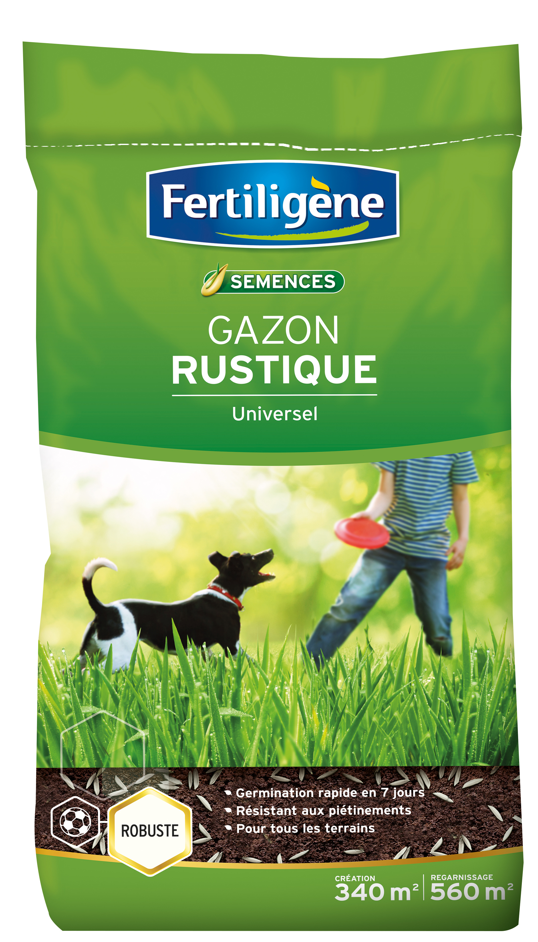 Le gazon Rustique Fertiligène s'utilise sur tous les terrains. Robuste, il assure une bonne résistance aux piétinements et une germination rapide en 7 jours.