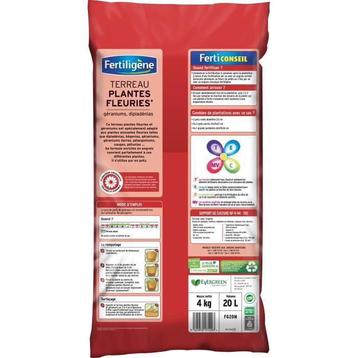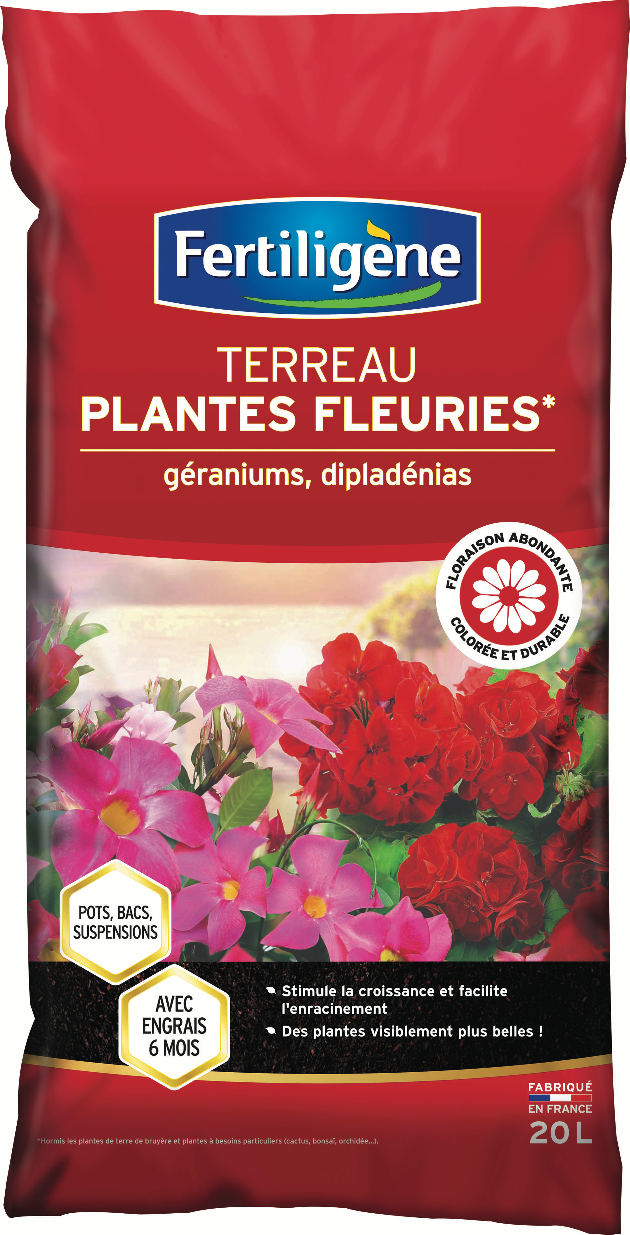 | Libellé | Fertiligène Terreau plantes fleuries, géraniums, dipladénias 20L |