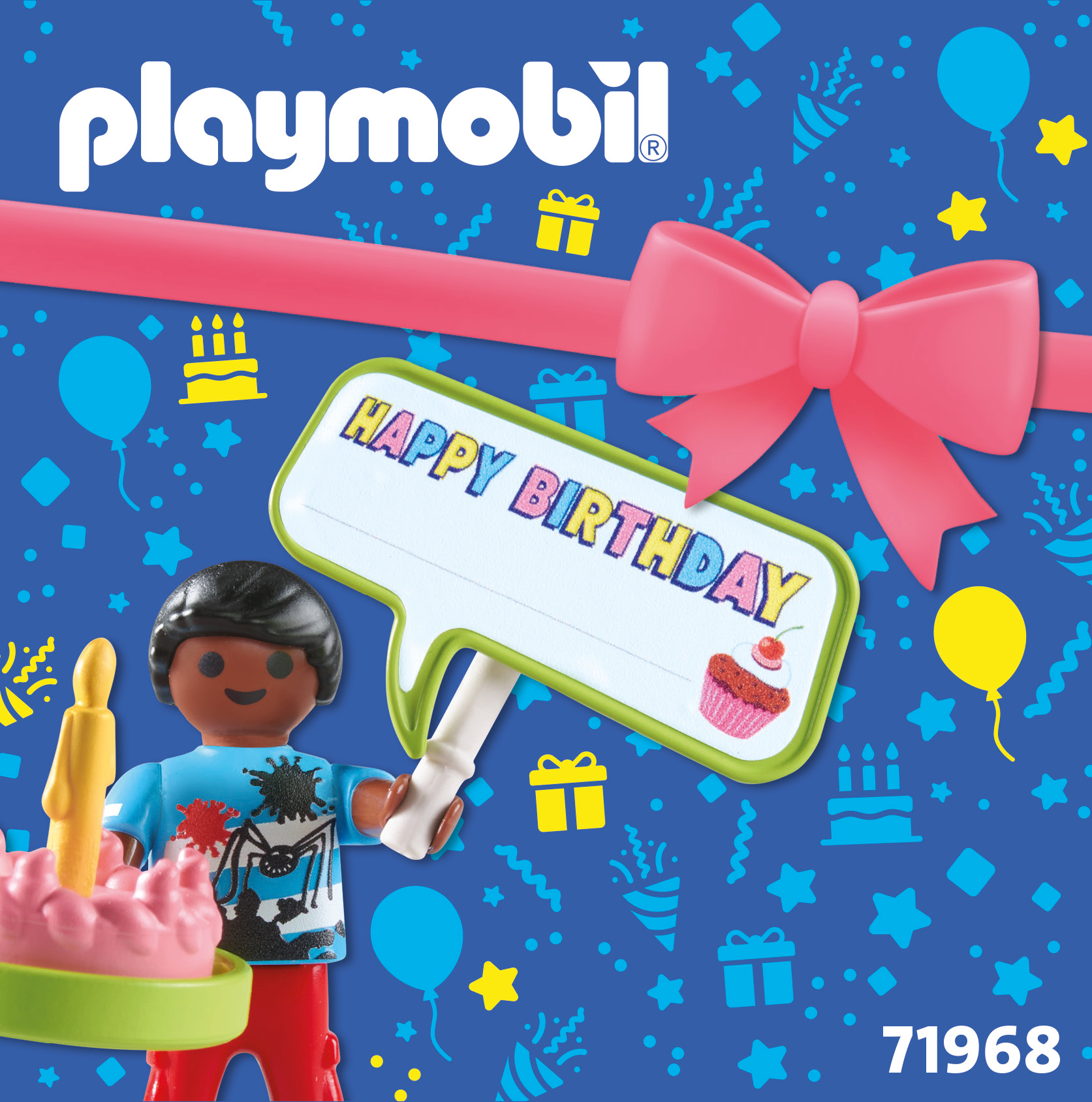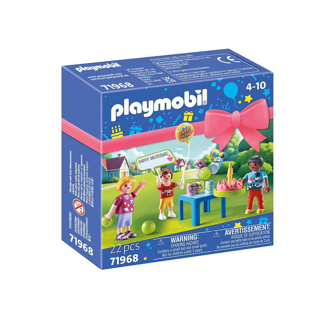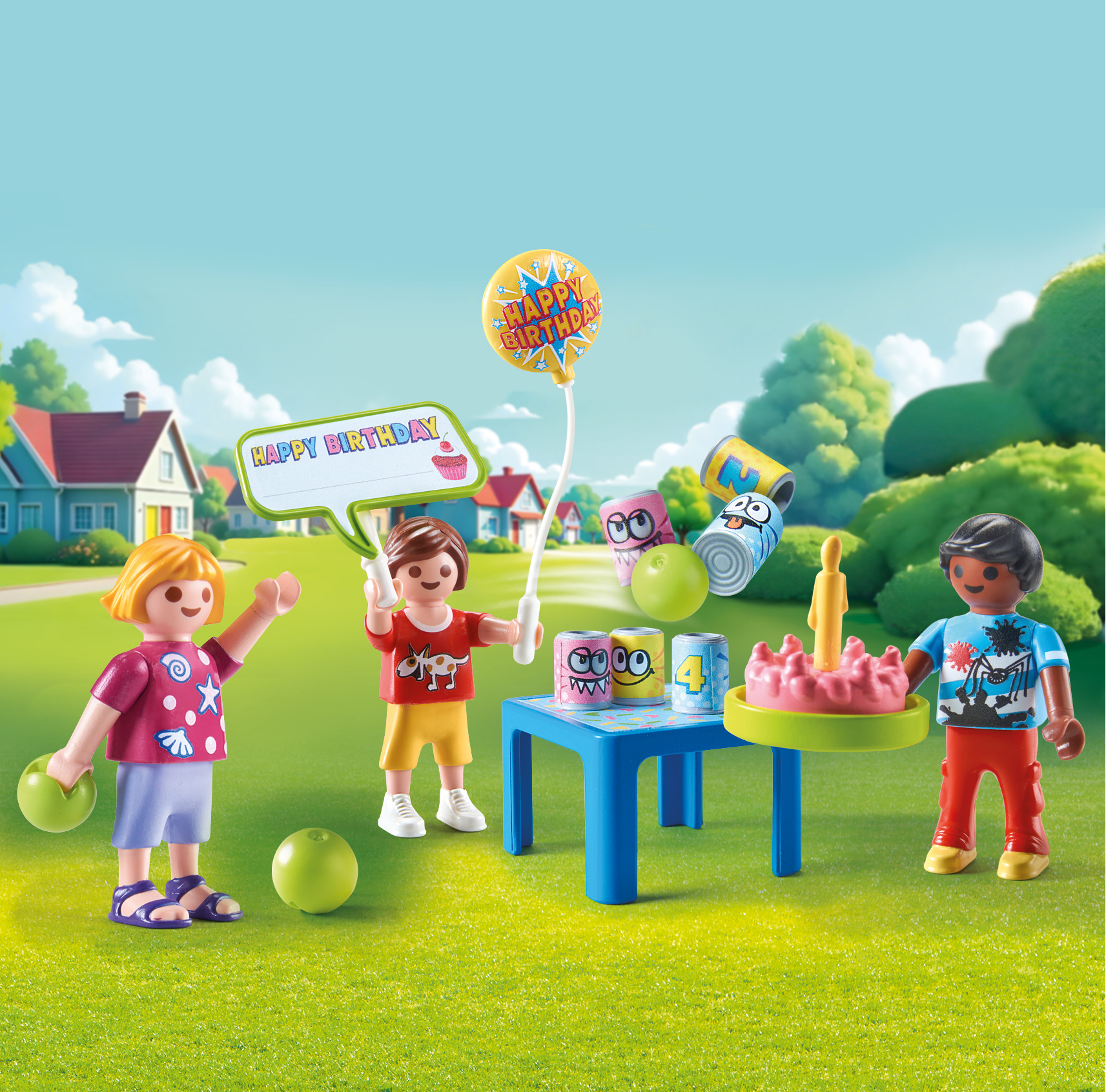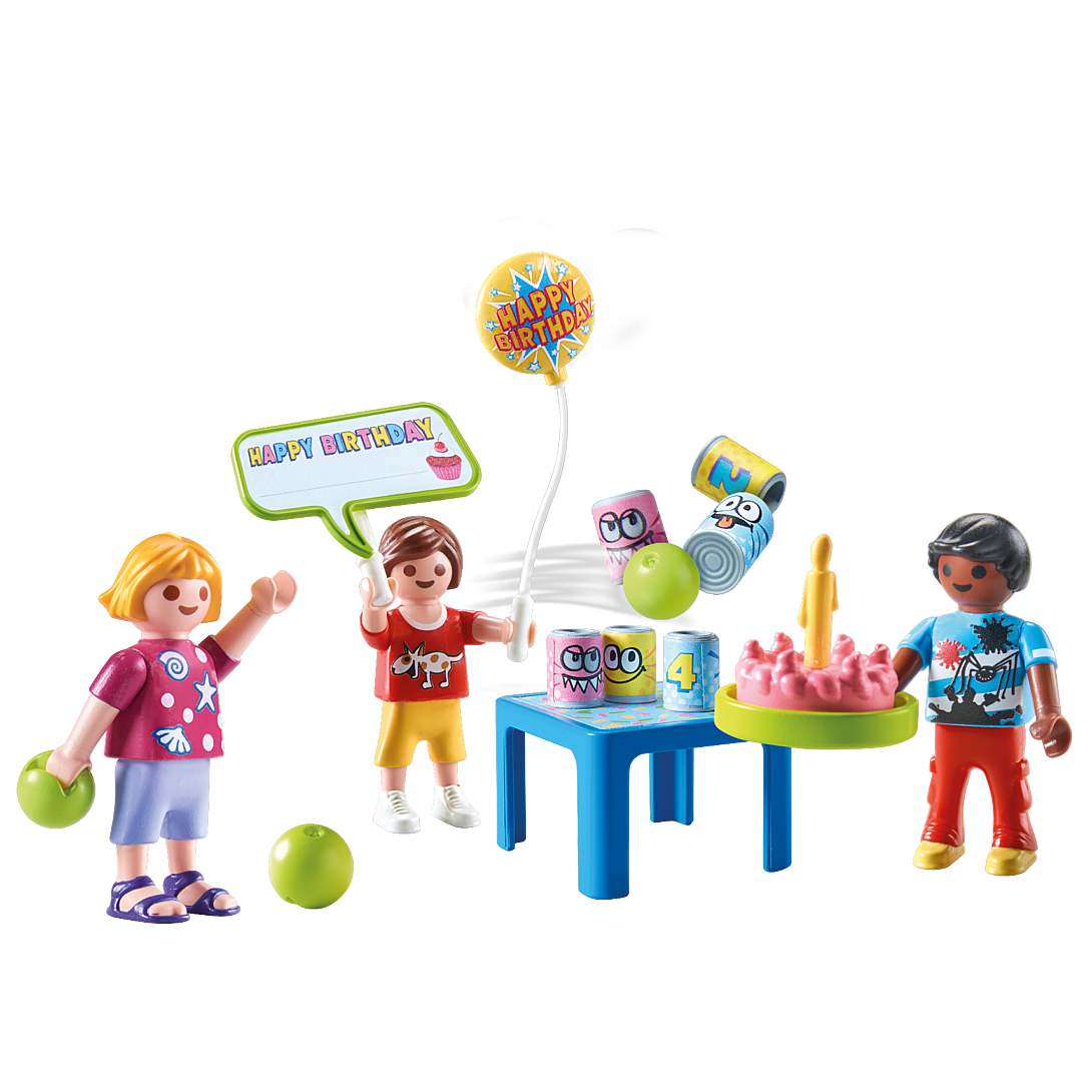 Personnages : 1 fille, 2 garçons Accessoires : 1 petite table, 6 boîtes de conserve, 3 balles, 1 ballon, 1 gâteau d'anniversaire avec bougie, 1 panneau personnalisable