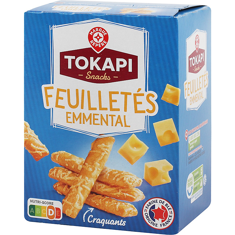 Farine de blé 68 % ; huiles végétales (colza, tournesol) ; emmental râpé 15 % ; sucre ; poudres à lever : E503, E341, E500 ; sel ; farine d'orge maltée ; sirop de sucre inverti. Traces de graines de sésame.