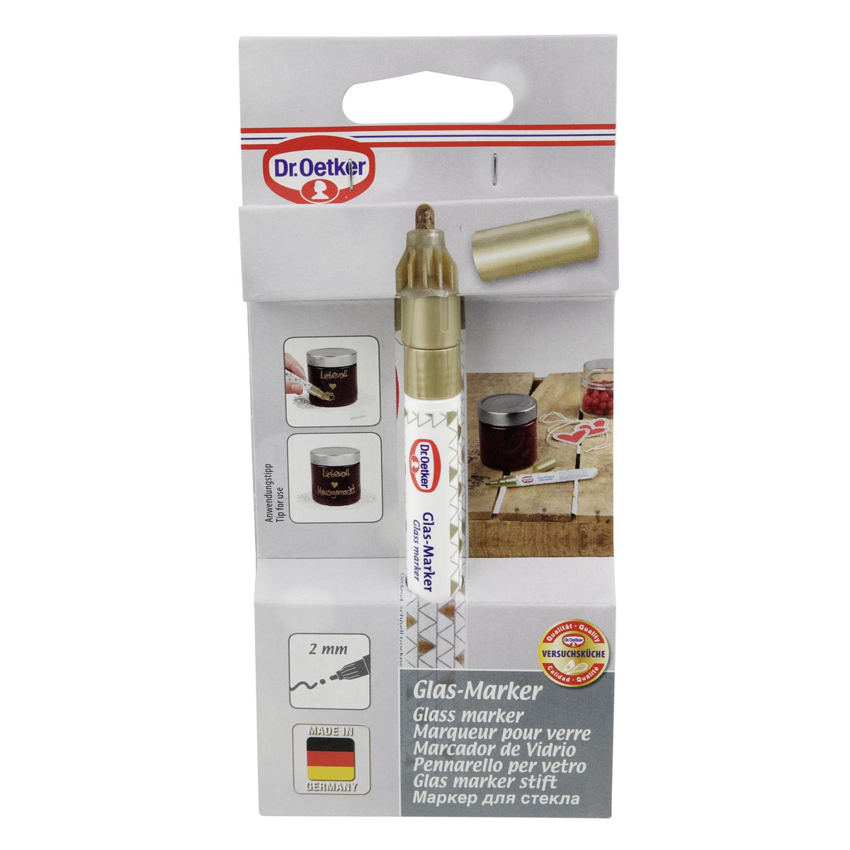 DESCRIPTION : Dr Oetker vous propose ce marqueur pour écrire sur le verre, la céramique, la porcelaine, le bois, le métal, la pierre, ou encore le carton LE PETIT + : Ce marqueur est effaçable à l'eau chaude et au savon DIMENSIONS : 13x2cm CONTENU : 1x feutre spécial pour écriture sur verre ENTRETIEN : L'encre se nettoie à l'aide d'une éponge, de liquide vaisselle et d'eau tiède. L'entreprise Fackelmann développe depuis 100 ans des ustensiles de cuisine qui vous rendent la vie plus facile. De la pâtisserie au rangement en passant par la cuisine et les gadgets qui simplifient votre quotidien, du bois à l'inox en passant par l'émail et le silicone, Fackelmann couvre tous les domaines de votre cuisine. Simplifiez vous la vie grâce à nos outils et accessoires Fackelmann. Fackelmann vous propose ce marqueur pour verre doré. Avec ce produit, vous pourrez facilement écrire sur tous vos bocaux en verre ou vos ustensiles en porcelaine, métal, bois ou carton. Il peut être utile pour étiquetter vos espaces de rangement ou les légender. Conseils d'utilisation : Le marqueur s'efface avec une éponge, de l'eau chaude et du liquide vaisselle. Dimensions : Pointe de 2mm
