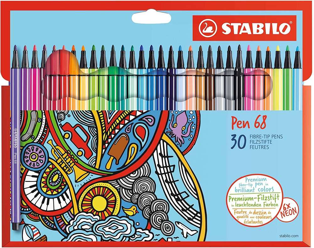 STABILO - Feutres "Pen 68" - Etui en carton de 30 . Grâce à son encre à base d'eau et sa pointe moyenne robuste, STABILO Pen 68 est idéal pour les aplats de couleurs, le dessin, le handlettering et tous vos autres projets de DIY. En plus, il peut rester ouvert jusqu'à 24h sans sécher !.