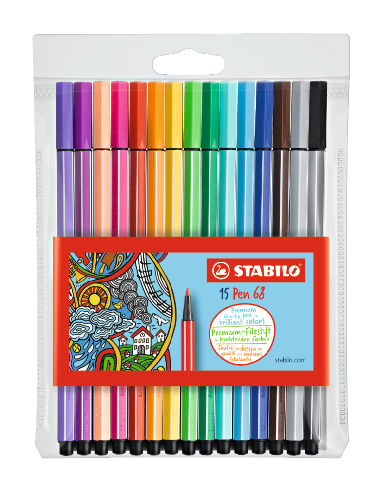STABILO - Feutres stabilo Pen 68 - Pochette de 15 . Inspiré du design du célèbre STABILO point 88, STABILO Pen 68 est un feutre pour le dessin de grande qualité à encre à base d'eau qui convient tout aussi bien aux jeunes artistes qu'aux professionnels du monde artistique.