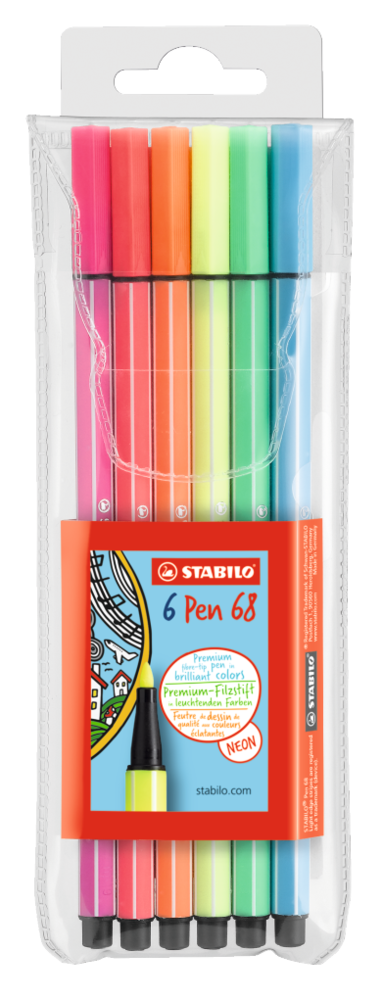 STABILO - Feutres stabilo Pen 68 - Pochette de 6 fluo . Inspiré du design du célèbre STABILO point 88, STABILO Pen 68 est un feutre pour le dessin de grande qualité à encre à base d'eau qui convient tout aussi bien aux jeunes artistes qu'aux professionnels du monde artistique.