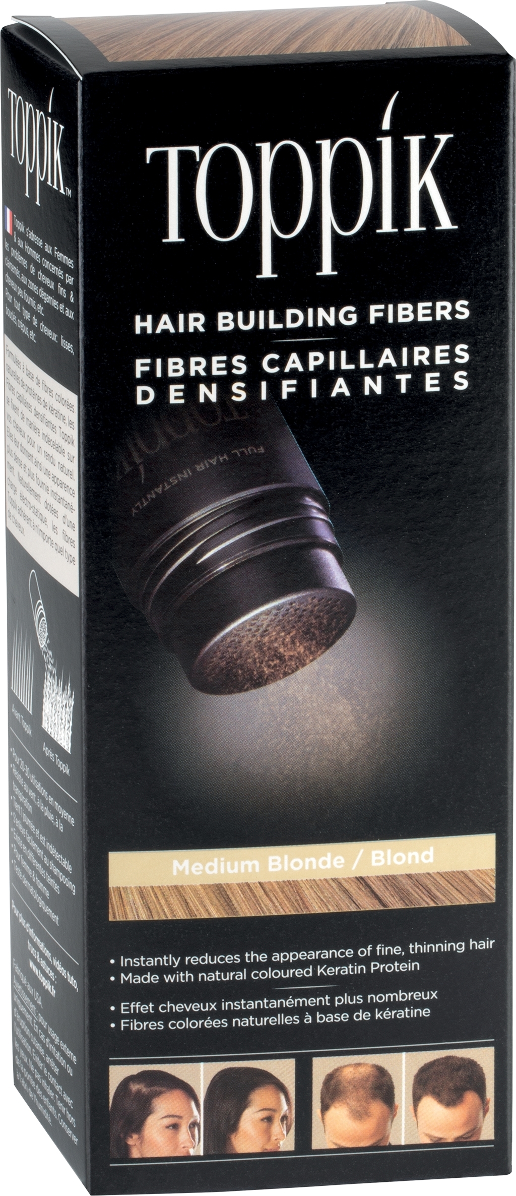 Les fibres capillaires densifiantes Toppik sont composées de protéines de kératine colorées et se lient de manière invisible aux cheveux existants pour leur donner du volume, combler les zones clairsemées, et dissimuler le cuir chevelu. Les fibres Toppik ont un effet densifiant instantané et donnent un aspect plus plein et plus épais aux cheveux même les plus clairsemés.