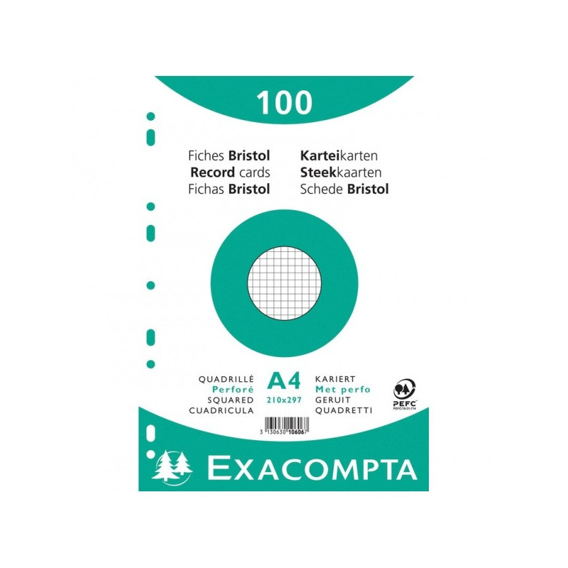 | Libellé | Fiches bristol - A4 - Petits carreaux - Perforées - Blanc - Lot de 100 - Exacompta |