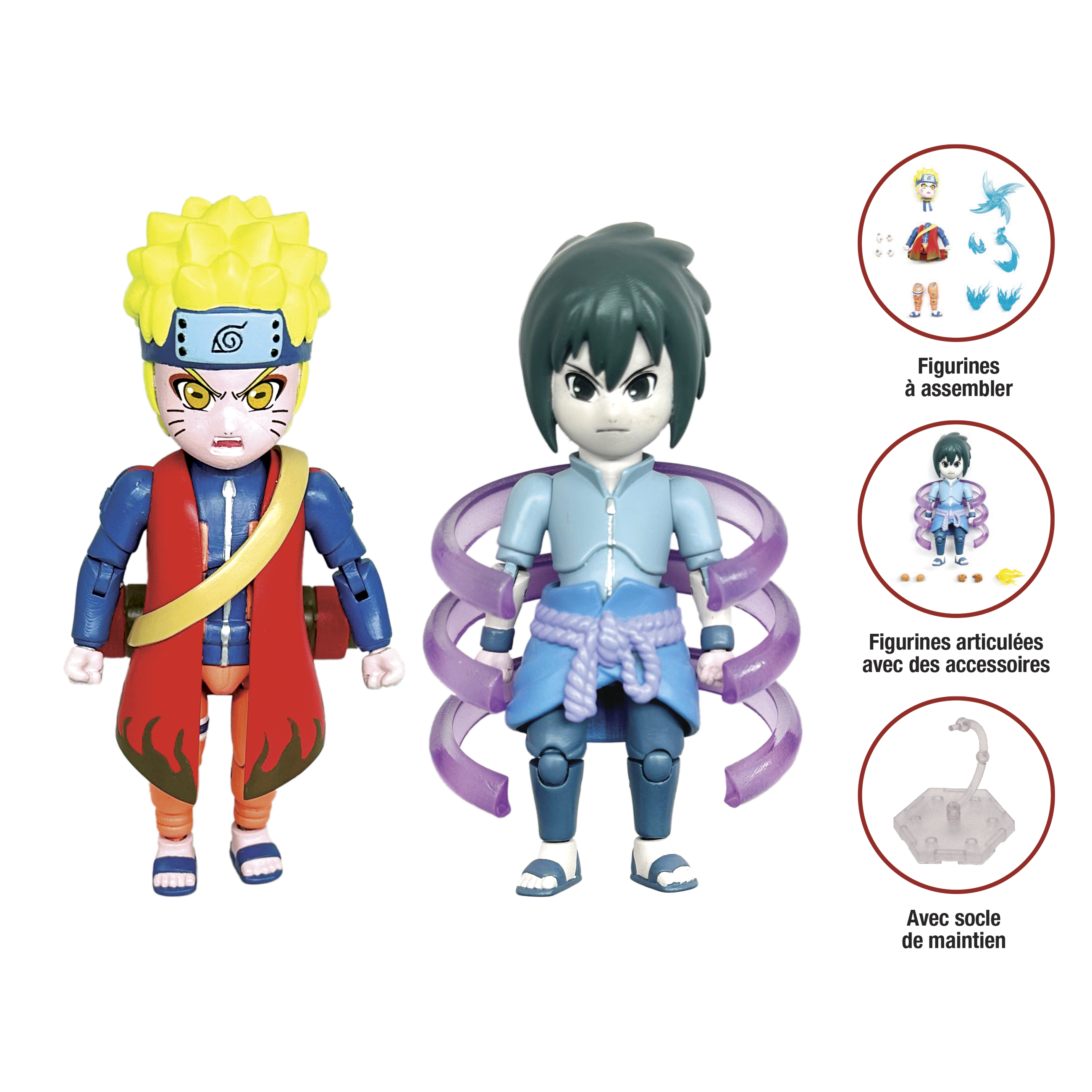 Figurine articulée du manga Naruto à construire et à collectionner - Assortiment de 2 personnages Naruto et Sasuke. 16 points d'articulations Personnalise ton héros préféré avec les accessoires (visages, mains et armes interchangeables) !