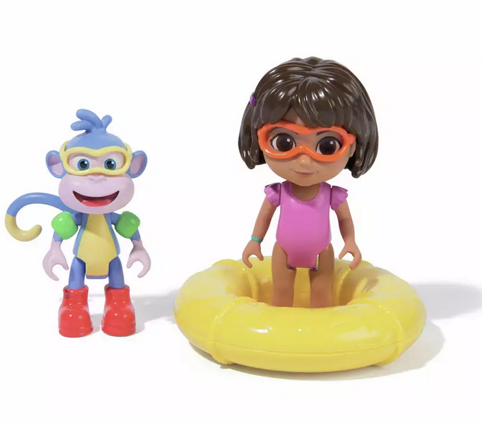Figurines prêtes à nager : comprend Dora avec des lunettes de natation, des palmes et une bouteille de plongée, avec un bouton pour lui faire battre les pieds, et Boots avec des lunettes de natation et des brassards. Les deux figurines ont des membres mobiles pour un jeu dynamique.
