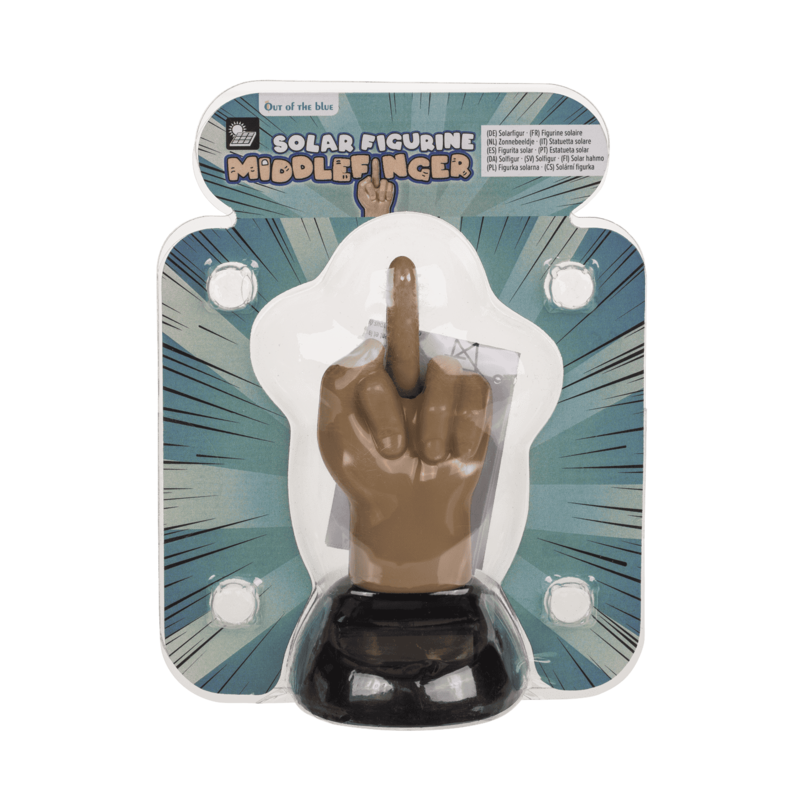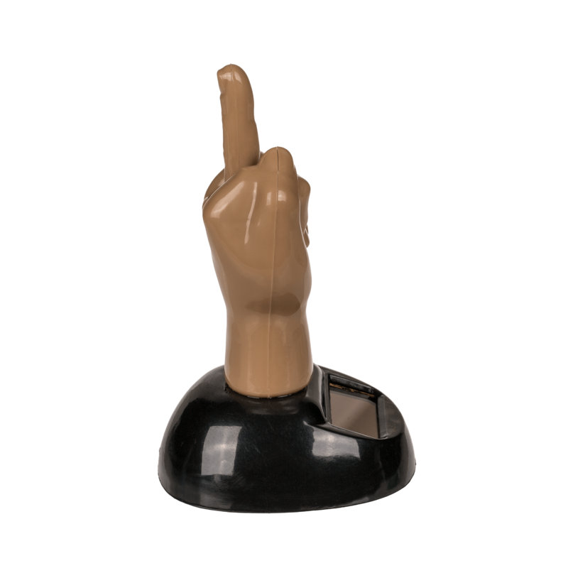 Cette main articulée est équipée d'une cellule photovoltaïque intégrée qui capte l'énergie solaire pour alimenter son mouvement. Dès qu'elle est exposée à la lumière, le doigt du milieu se redresse automatiquement, en boucle, comme pour lancer un message clair au monde entier : << Fuck the world! >>. Le tout, sans que vous ayez à bouger un muscle.