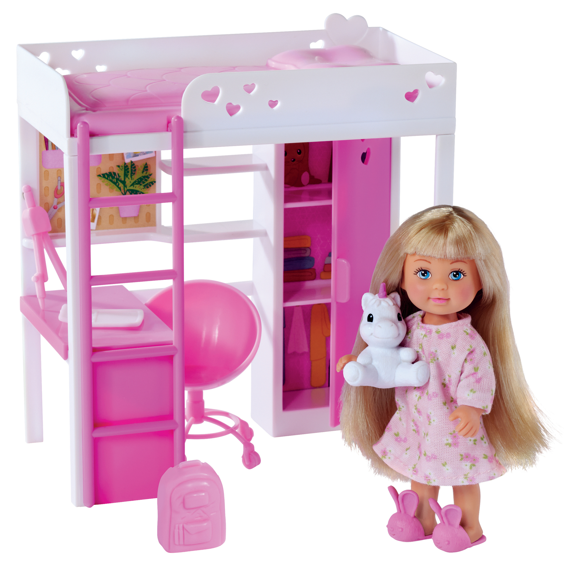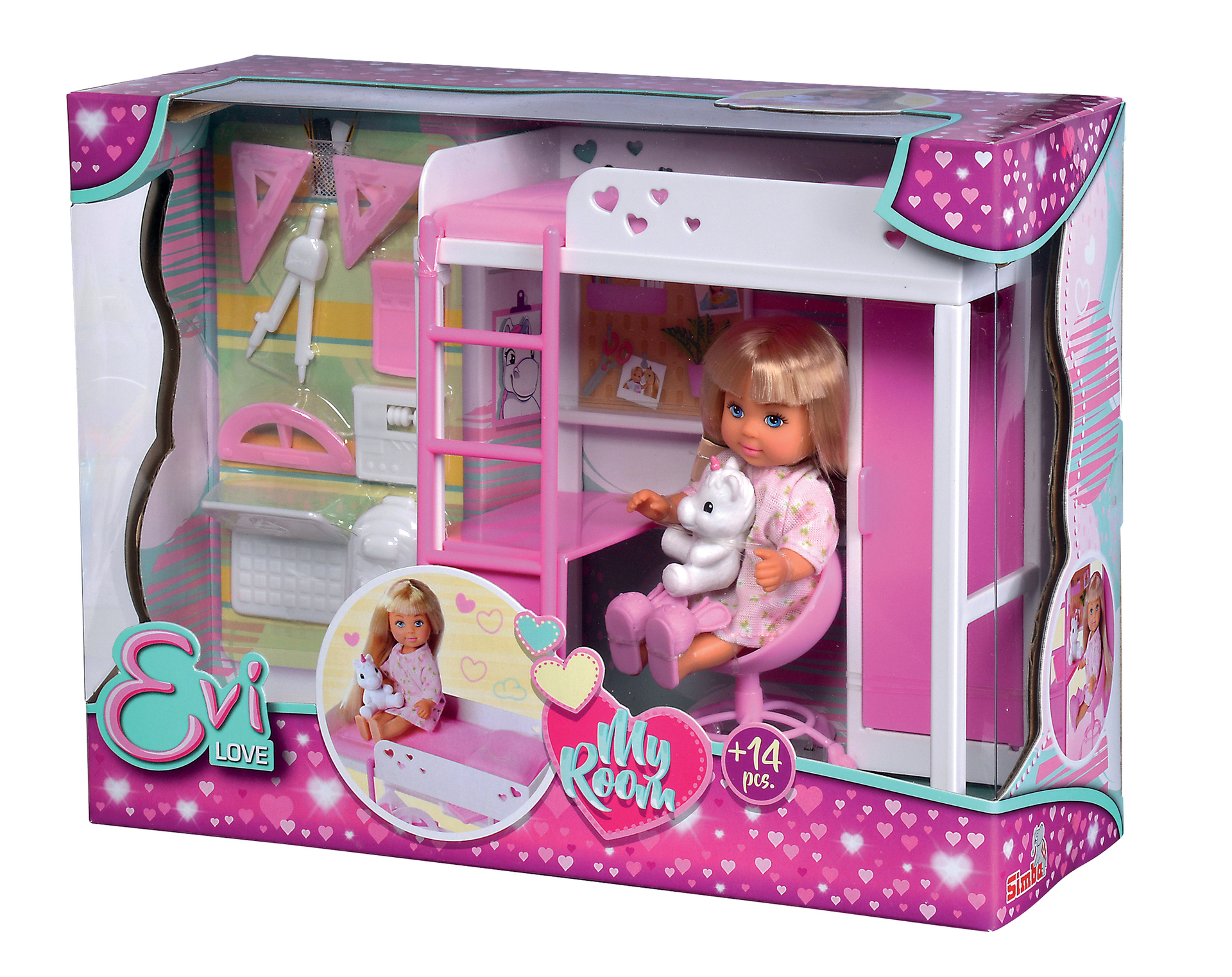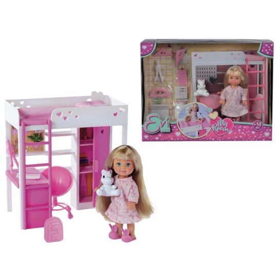Ta mini poupée mannequin Evi 12cm joue dans sa jolie chambre. Evi peut faire ses devoirs grâce à son bureau et son matériel de géométrie, ranger ses affaires dans le dressing ou aller se coucher. Elle est accompagnée de sa peluche licorne trop mignonne. À partir de 3 ans.