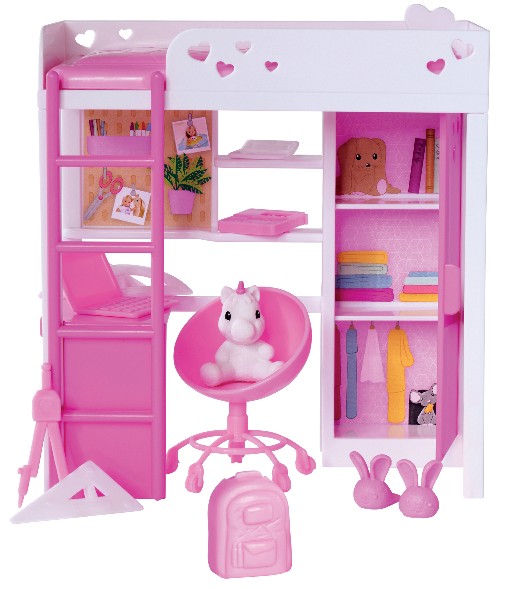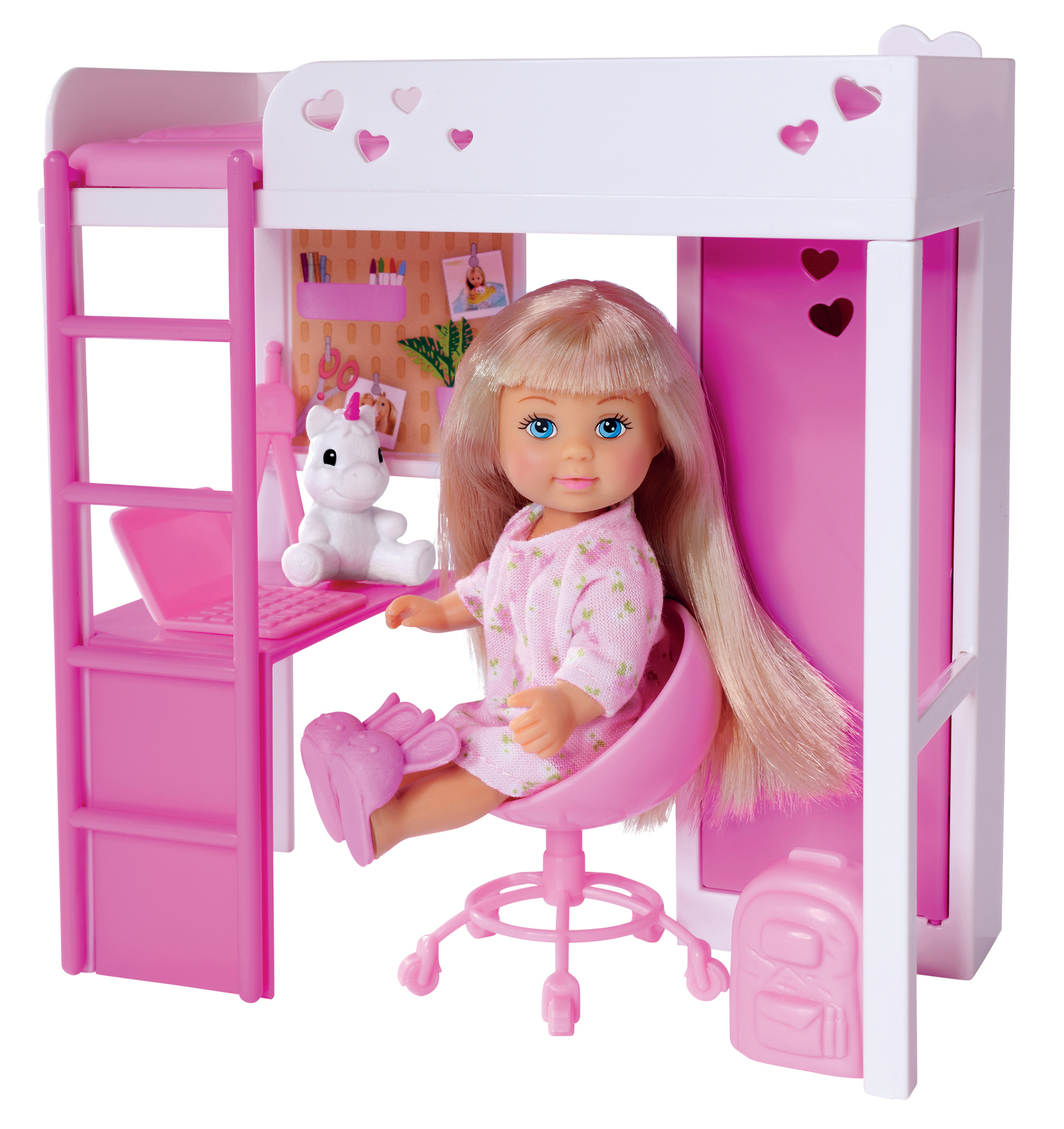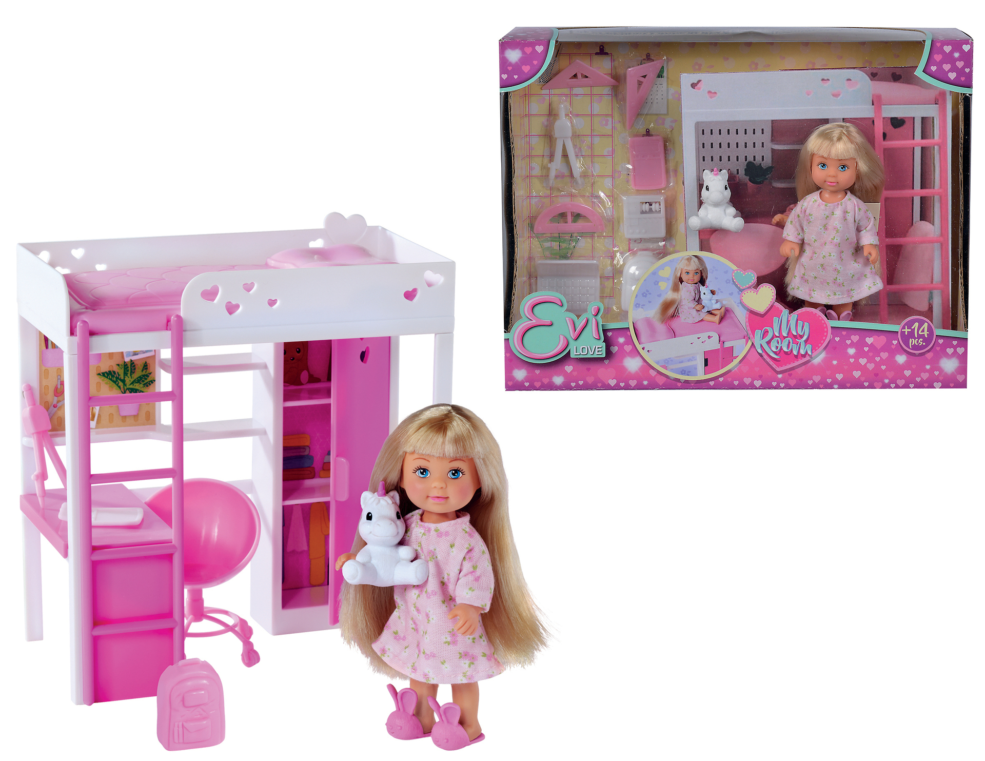 Ta mini poupée mannequin Evi 12cm joue dans sa jolie chambre. Evi peut faire ses devoirs grâce à son bureau et son matériel de géométrie, ranger ses affaires dans le dressing ou aller se coucher. Elle est accompagnée de sa peluche licorne trop mignonne. À partir de 3 ans.