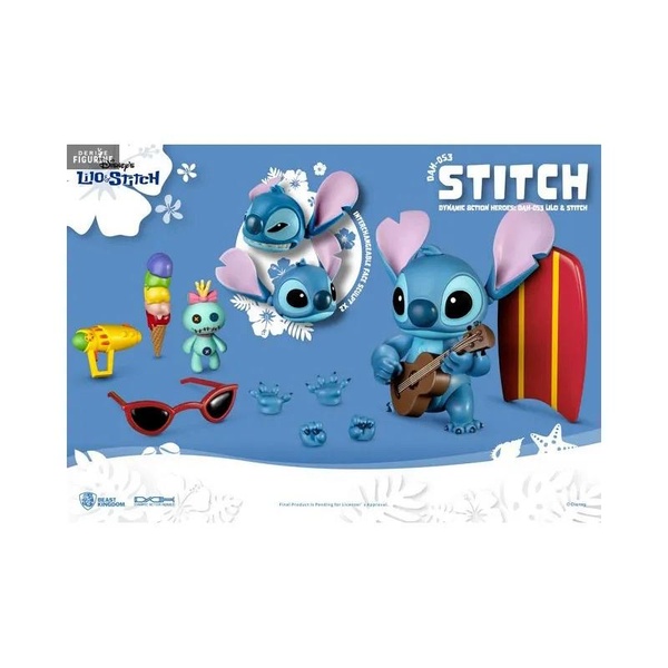 \"Stitch, le protagoniste espiègle de \"\"Lilo & Stitch\"\" de Disney (également connu sous le nom d'Expérience 626) est ici avec douze articulations mobiles, des visages interchangeables, des mains interchangeables et une variété d'accessoires liés à Stitch. Ces fonctionnalités permettent aux fans de jouer avec Stitch et de l'habiller à leur guise, que ce soit en portant ses belles lunettes de soleil, en mangeant une glace ou en jouant de son ukulélé et en chantant. Nous n'arriverez plus à vous séparer de Stitch avec son attitude adorable et loufoque. Baladez-vous avec lui et profitez de l'ambiance hawaïenne ! Caractéristiques spéciales : - Figurine Dynamic Action Heroes Stitch avec 12 articulations mobiles - Deux visages interchangeables (expressions normale et en colère) - Deux styles de mains interchangeables (main ouverte et tenant un objet) - Accessoires : lunettes de soleil, cornet de glace, planche de surf, Scrump, ukulélé, pistolet laser.\".