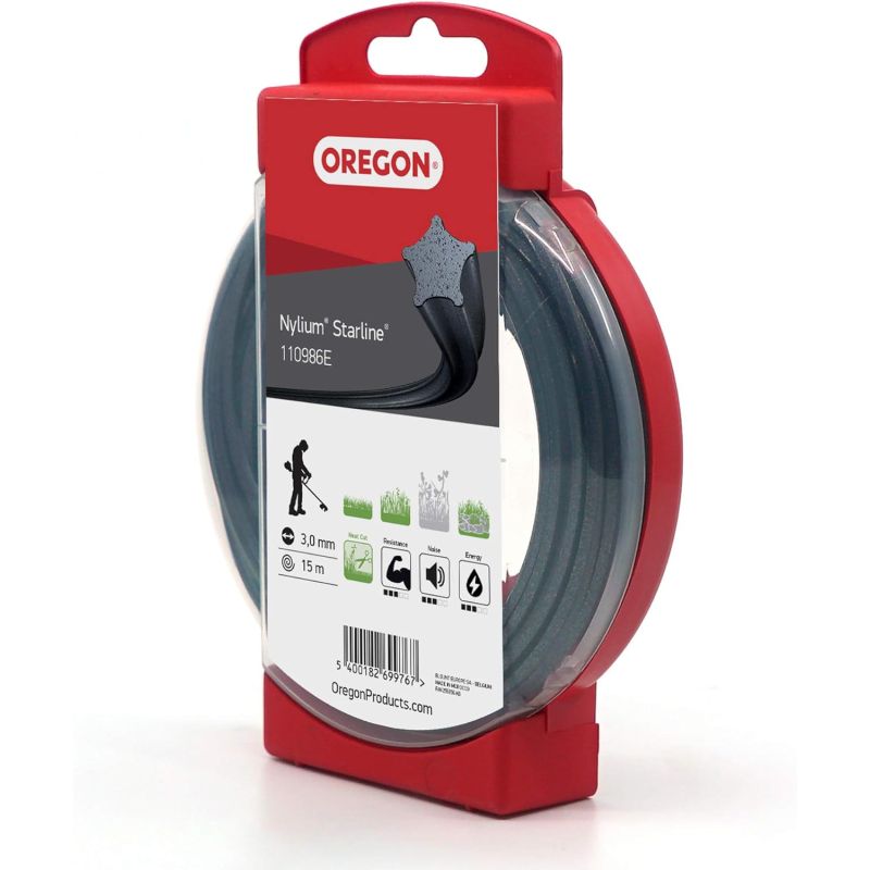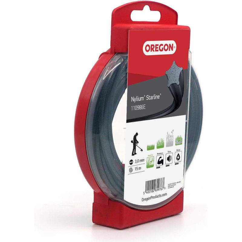 Renforcement des propriétés de conductivité et de refroidissement du fil grâce aux particules d'aluminium intégrées au Nylium Résistance remarquable à la cassure au niveau des oeillets de la tête Résistance élevée à la chauffe du fil à l'intérieur de la tête Coupe nette de l'herbe grâce à la forme en étoile, pour une superbe pelouse La forme étoilée permet d'utiliser moins de puissance du moteur par rapport au fil rond standardCaractéristiques techniques Découvrez le fil de coupe Nylium Starline de la marque Oregon qui convient pour votre débroussailleuse Matière du fil : Nylium Starline Couleur du fil : Noir Forme du fil : Etoile Diamètre du fil : 3.0mm Longueur du fil : 15m Référence du fil : 110986E Convient pour : Herbes basses, Herbes Hautes, Sols rocailleux Résistance à l'usure: 3/5 Niveau de bruit : 3/5 Consommation d'énergie : 3/5 Conditionnement : Coque