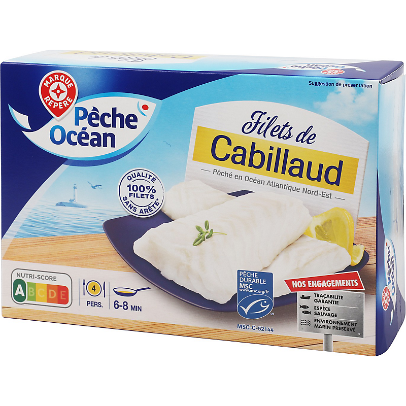 Filets de cabillaud* (Gadus morhua) pêché en océan Atlantique Nord-Est (mer de Norvège et mer du Nord) aux chaluts, sennes, filets maillants et filets similaires, filets tournants et filets soulevés - surgelés *Qualité sans arête : bien qu’un soin tout particulier ait été pris pour éliminer toutes les arêtes, quelques-unes peuvent exceptionnellement se retrouver dans ce produit. PECHE OCEAN