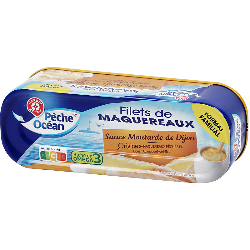 Liste des ingrédients : Filets de maquereaux 55,8 % ; eau ; moutarde de Dijon 12,1 % (eau, graines de moutarde, vinaigre d'alcool, sel) ; vinaigre d'alcool ; huile de colza ; sel ; amidon modifié de maïs ; arôme naturel de poivre ; épaississants : gomme guar, gomme xanthane ; arôme naturel ; poivre noir ; curcuma.