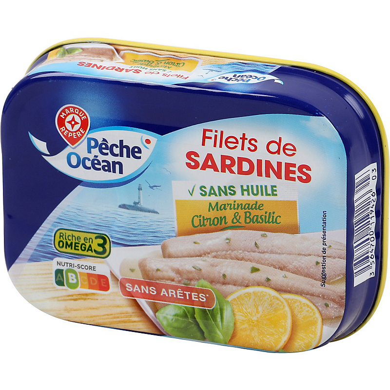 Ingrédients : Filets de sardines, eau, vinaigre d'alcool, citron 2 %, sel, sucre, arôme naturel de citron, basilic réhydraté 0,3 %, jus de citron concentré 0,1 %, épaississant : gomme xanthane.