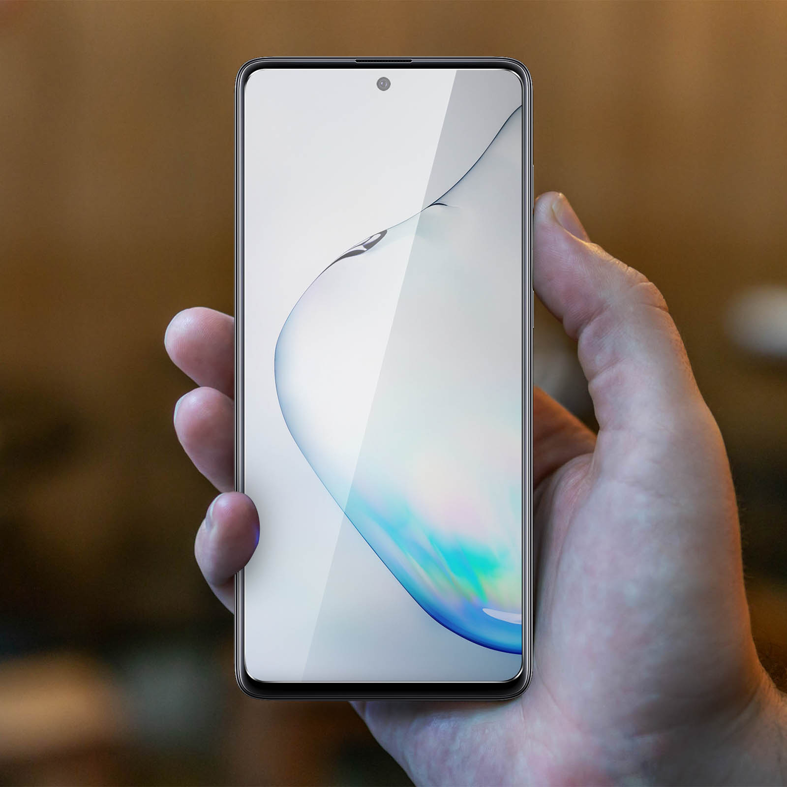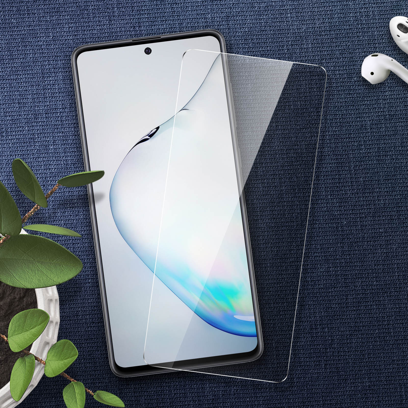 Film de protection écran en verre trempé pour Samsung Galaxy Note 10 Lite. Dureté 9H résistant aux chocs et rayures. Ultra-fin et transparent : fluidité tactile et rendu d'affichage conservés. Revêtement oléophobique. Anti-explosion.