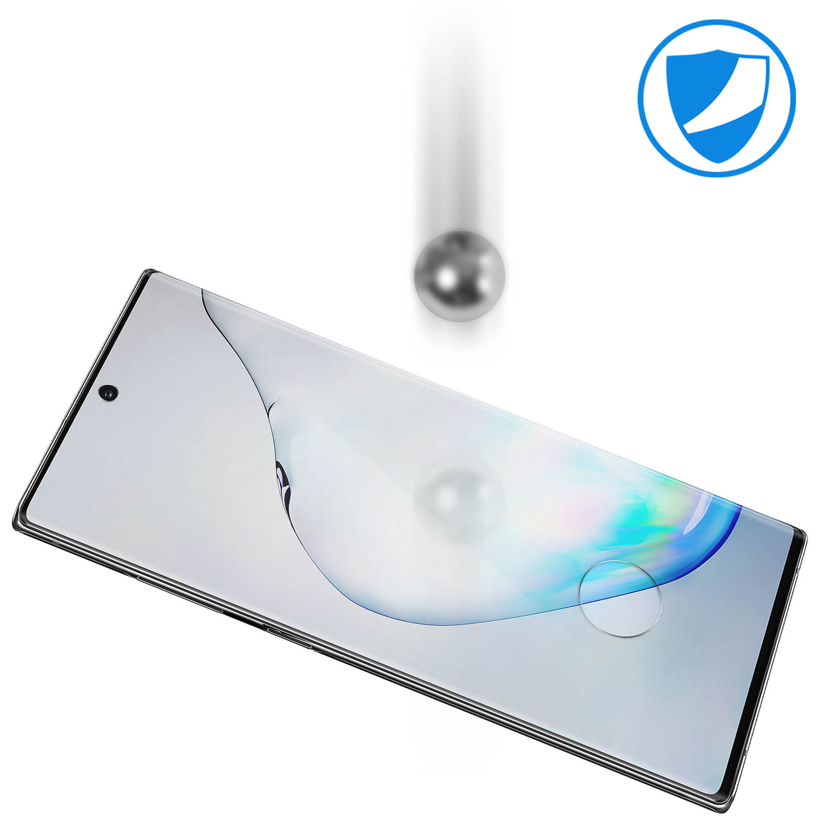 Film en verre trempé 9H pour Galaxy Note 10 Plus. Protection résistante contre les chocs et rayures. Transparent et Ultra-fin : fluidité du tactile et rendu de l'affichage conservés. Anti-traces. Compatible avec le capteur d'empreintes digitales.