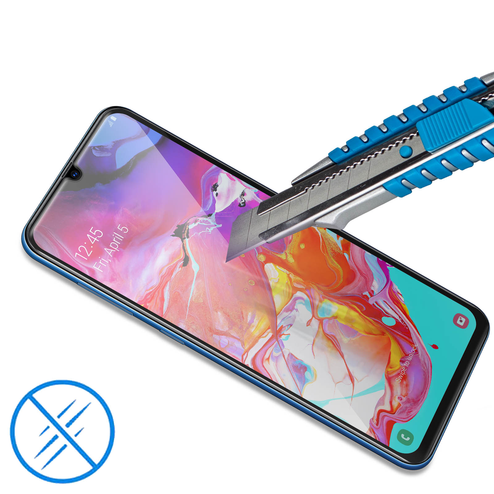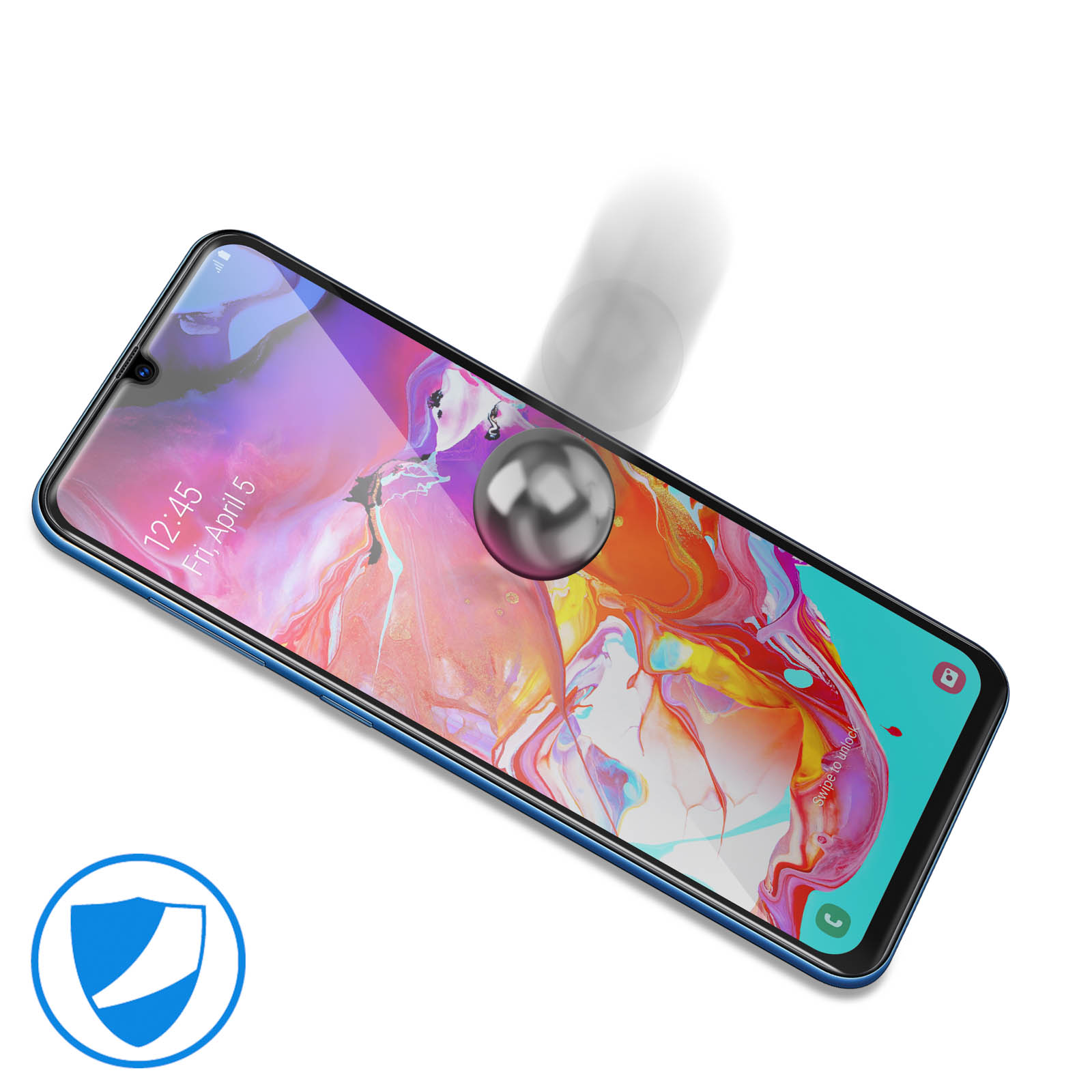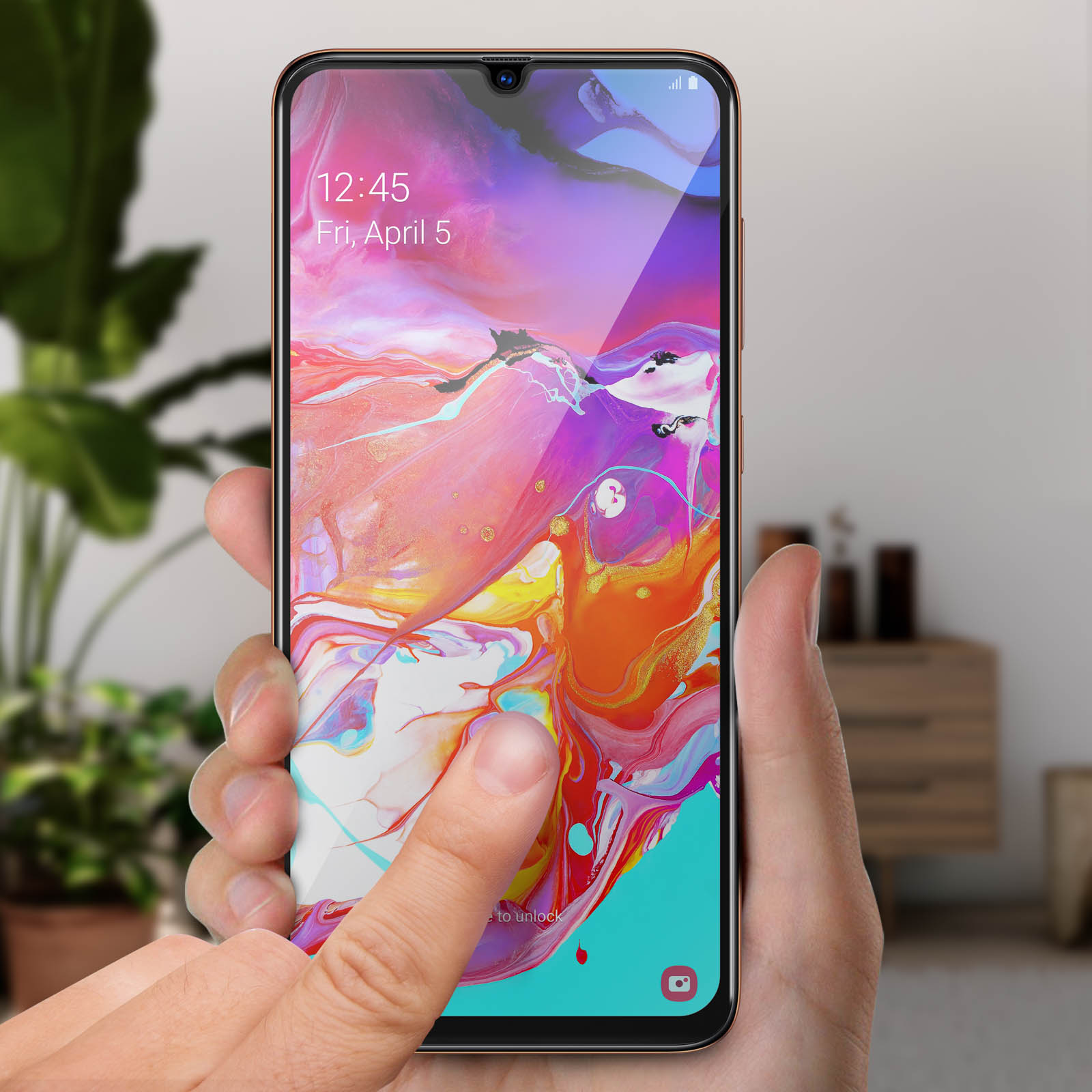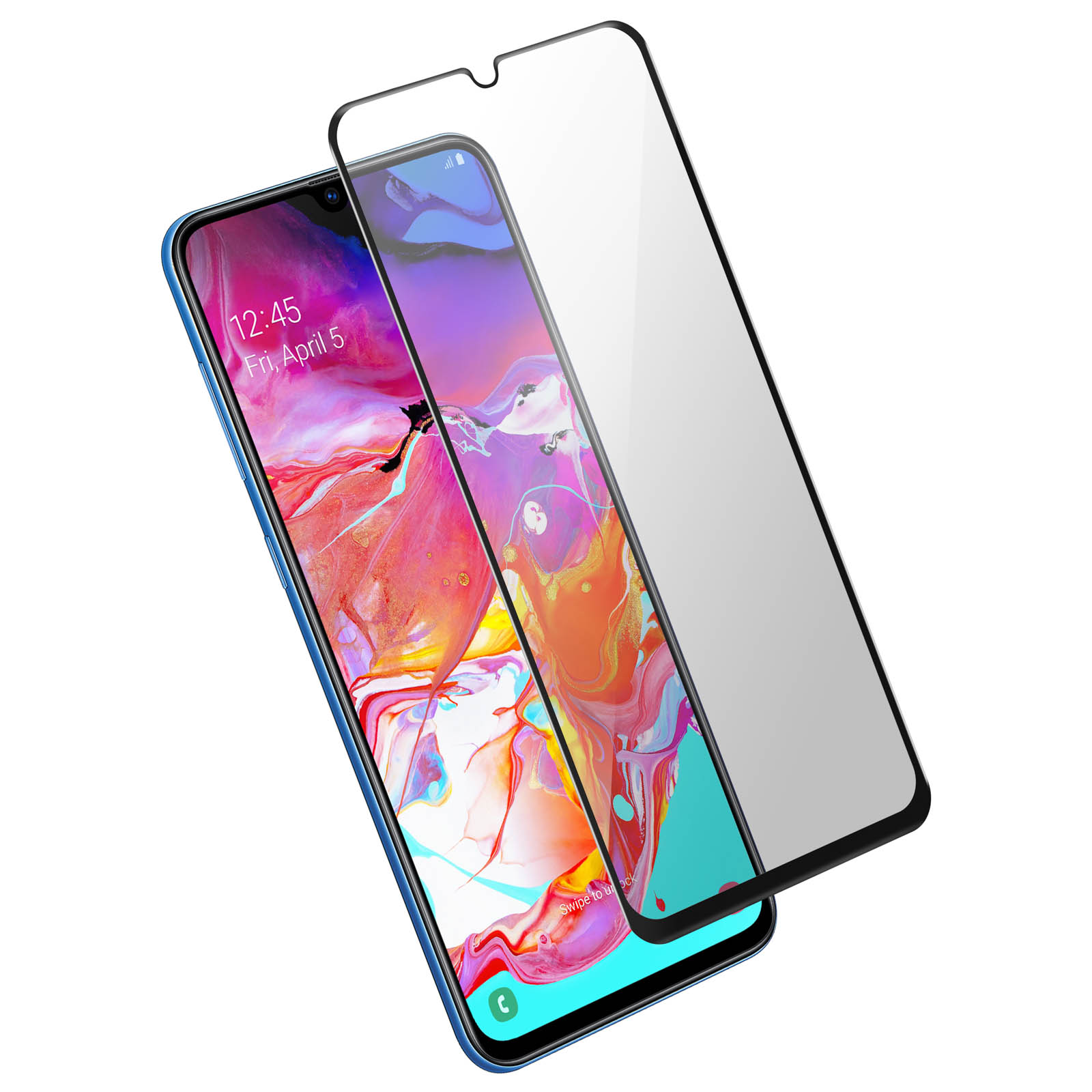 Film intégral en verre trempé pour Samsung Galaxy A70. Protection ultra-résistante contre les chocs, traces et rayures. Parfaite adhésion avec l'écran. Sensibilité tactile et rendu de l'affichage conservés.
