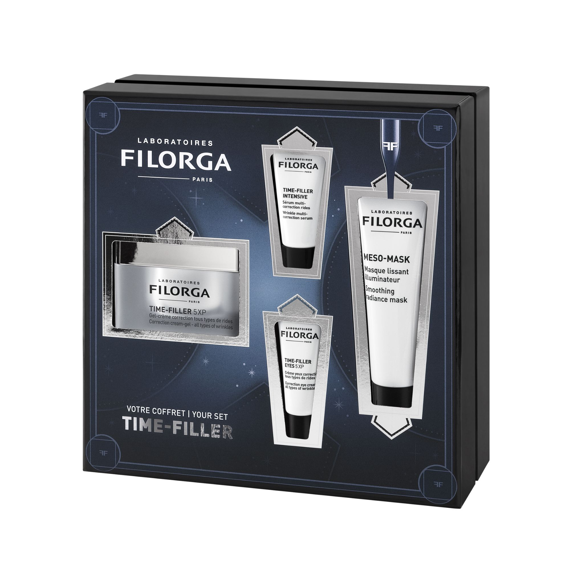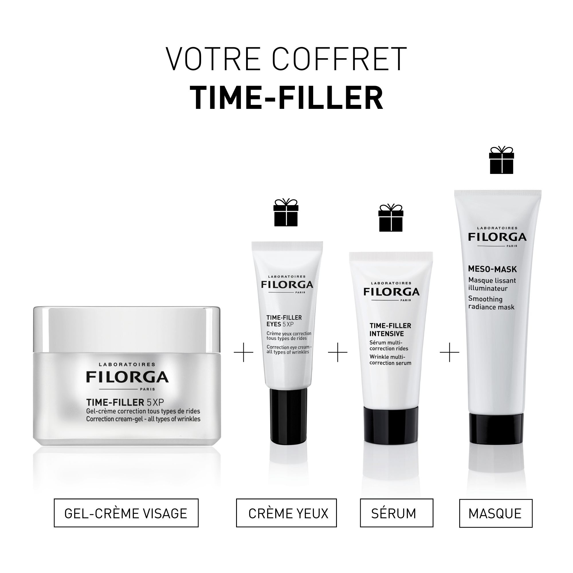 TIME-FILLER 5XP CRÈME 50ml Corrige les rides du visage et du cou (Acide hyaluronique / Tripeptide) TIME-FILLER EYES 5XP 4ml Cible les rides du contour des yeux (Peptide / NCEF) TIME-FILLER INTENSIVE 7ml Fournit un lissage express des rides (Hexapeptide / Polysaccharides) MESO-MASK 30ml Illumine le teint (Collagène / Élastine)