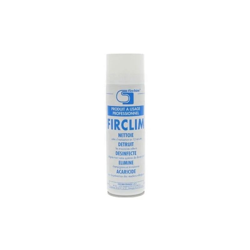 Firclim 4 sprays antibactérien nettoyant aérosol pour clim 500ml Nettoyant anti-bactérien à pulvériser dans les systèmes de climatisation. Firclim traite intégralement votre système de climatisation : il nettoie le circuit, détruit les germes, combat les moisissures, les acariens et laisse un parfum frais. En 15 minutes, l'atmosphère de votre pièce redevient saine pure et agréable. Firclim est compatible avec tous les systèmes de climatisation. reste efficace pendant 3 mois. Utiliser les produits biocides avec précaution. Avant toute utilisation, lisez l'étiquette et les informations sur le produit Numéro de déclaration du produit à l'inventaire SIMMBAD 51933 Désinfectant des systèmes de climatisation et de ventilation (véhicules et locaux). La climatisation génère des germes et des moisissures. Ceci peut provoquer rhumes, irritations et dégagement de mauvaises odeurs. Traite intégralement les circuits. Effectuer de courtes pulvérisations (5 s) dans toutes les bouches d'aération. Laissez agir 10 à 15 min avant de remettre en route la climatisation en réglant la ventilation sur position maxi. Renouveler le traitement tous les 3 mois minimum.
