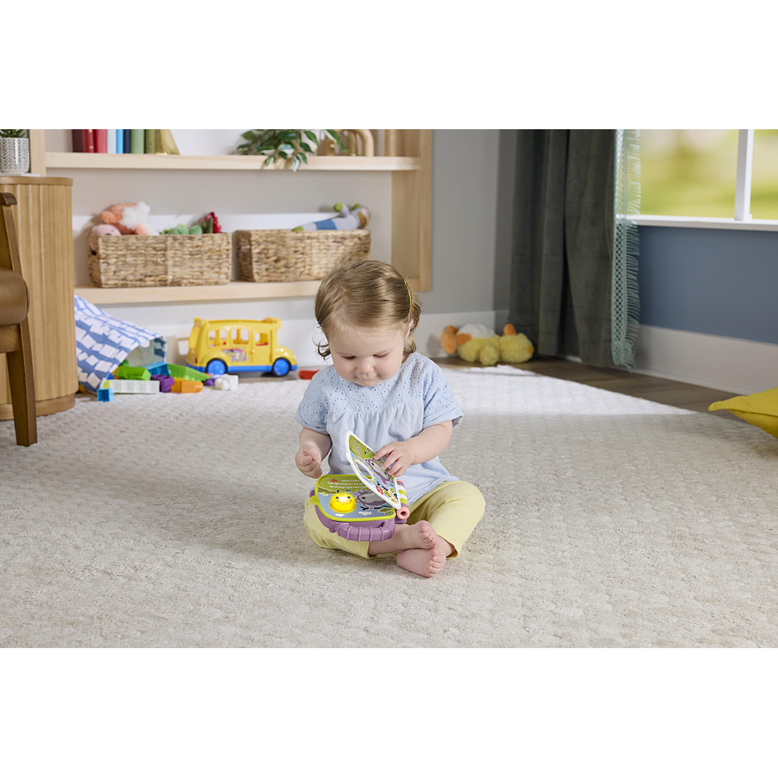 Bébé peut câliner son meilleur ami avec ce livre interactif de comptines qui joue la chanson populaire du singe violet reprise du Tapis d’éveil et d’activités Piano Deluxe de Fisher-Price* le plus vendu ! Le livre interactif Comptines du singe violet contient 2 pages faciles à tourner, d’adorables illustrations inspirées des chansons et des paroles imprimées pour encourager les tout premiers apprentissages. Il suffit d’appuyer sur le bouton soleil ou de tourner les pages pour activer les lumières, la musique et les sons ! La poignée facile à saisir est parfaitement adaptée pour permettre aux enfants de transporter leur « livre » préféré partout. Les couleurs et les décorations peuvent varier. (*Tapis d’éveil pour bébé n° 1 dans le monde d’après les données mondiales de NPD pour 2018-2023 ; tapis vendu séparément. Certains produits peuvent ne pas être commercialisés.)