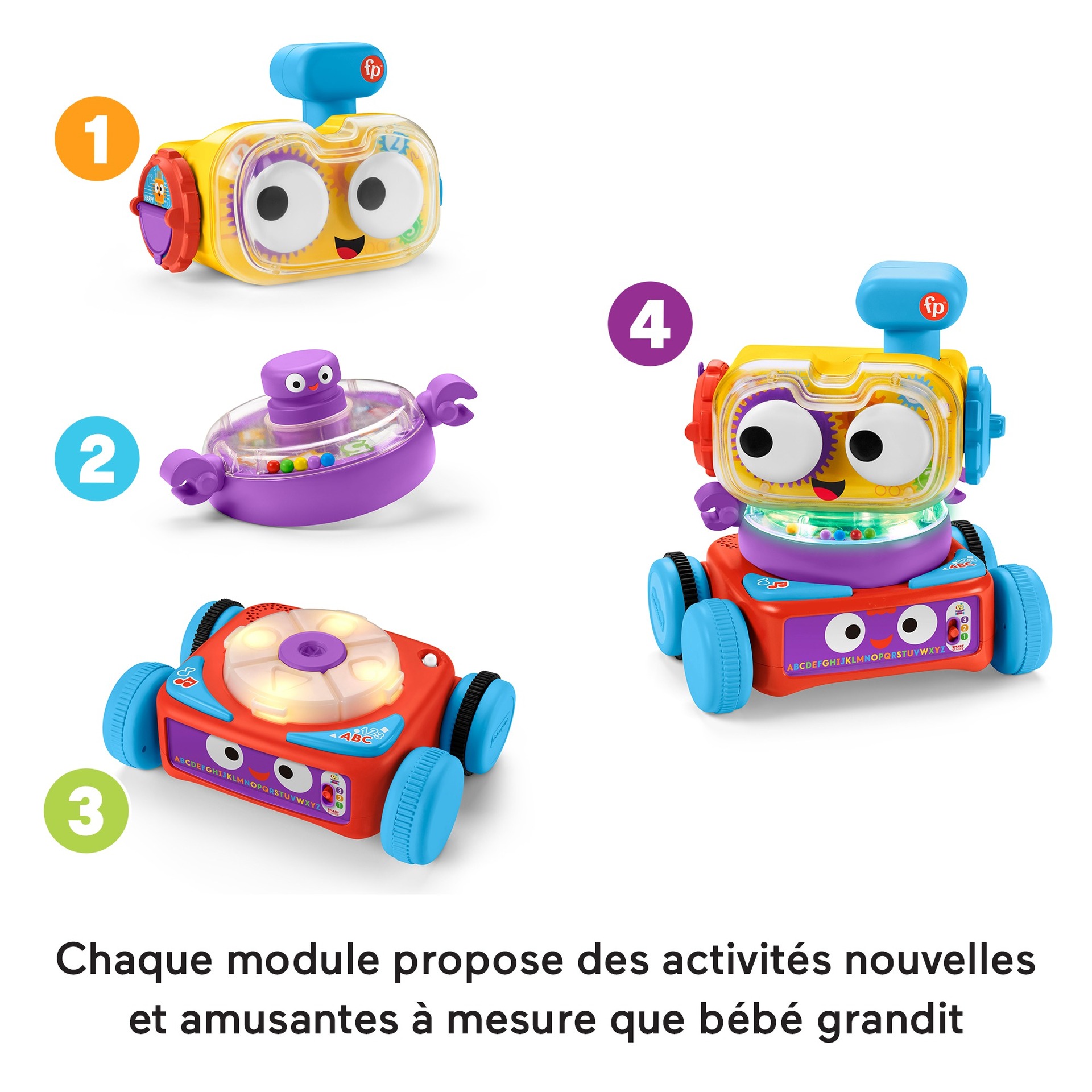 | Plus produit | Avec ce jouet 4-en-1, bébé ne se lassera jamais dapprendre en samusant, des premiers mois aux premiers pas (à partir de 6 mois) ,Chaque robot réserve des activités amusantes à bébé. Assemblez-les pour offrir un copain robot interactif à votre bébé ! ,3 niveaux dÉveil Progressif avec plus de 120 chansons, sons et phrases pour apprendre les chiffres, les lettres, les formes, les couleurs, à compter et bien plus encore ,Appuyez sur nimporte quel bouton du robot motorisé pour le voir partir en jouant des mélodies et en séclairant pour encourager bébé à le suivre à quatre pattes ,Une multitude dactivités pour le jeu assis dont une antenne sur laquelle on peut appuyer, des oreilles qui tournent et une base culbuto avec des perles qui font du bruit en tourbillonnant |