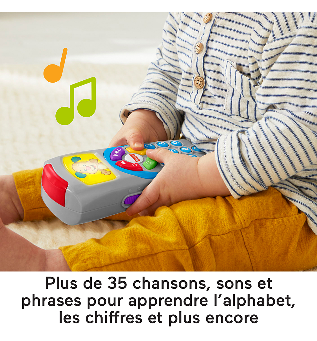 La Télécommande de Puppy Rires et Éveil® de Fisher-Price® ressemble à une vraie télécommande de télévision, mais avec des fonctionnalités amusantes pour stimuler l’imagination de bébé. Lorsque bébé appuie sur les boutons, l’écran Puppy s’allume, activant des chansons et des phrases amusantes qui lui apprendront les chiffres, les lettres de l’alphabet, les contraires et bien plus encore. Parfaitement adapté aux petites mains, facile à attraper et à manipuler, ce jouet renforce la motricité fine comme la dextérité et la coordination œil-main.