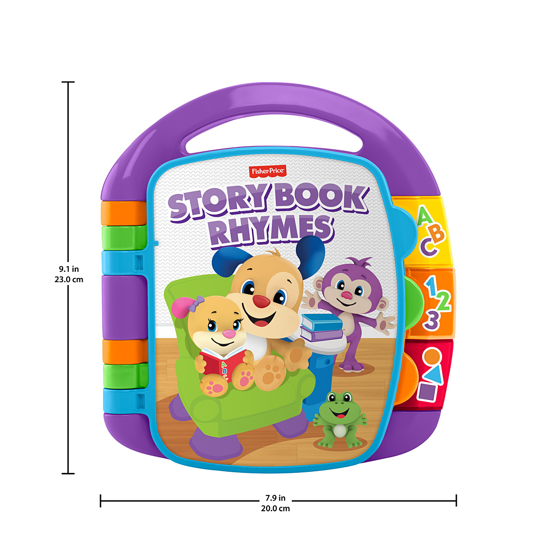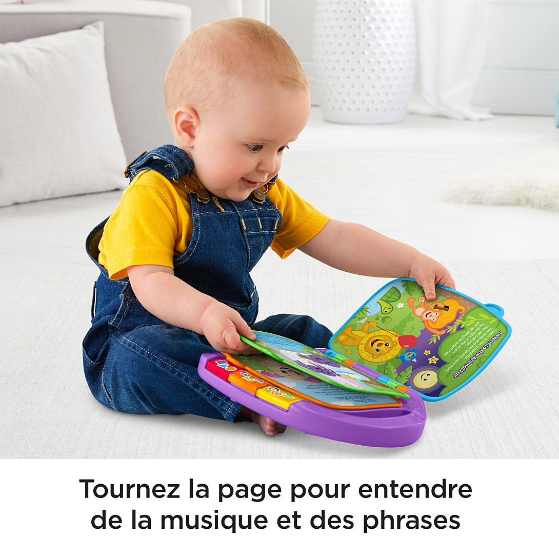 | Plus produit | Jouet déveil musical en forme de livre avec des illustrations mettant en scène Puppy et Sis, les meilleurs amis Rires et Éveil® de bébé\nBébé peut appuyer sur les boutons lumineux pour écouter des chansons et des phrases en français qui lui apprendront à compter, les premiers mots, les lettres, les chiffres, les formes et plus\nSix comptines différentes incluses\nBébé pourra facilement emporter son « livre » préféré partout grâce à la poignée de transport\nPour les enfants de 6 mois à 3 ans |