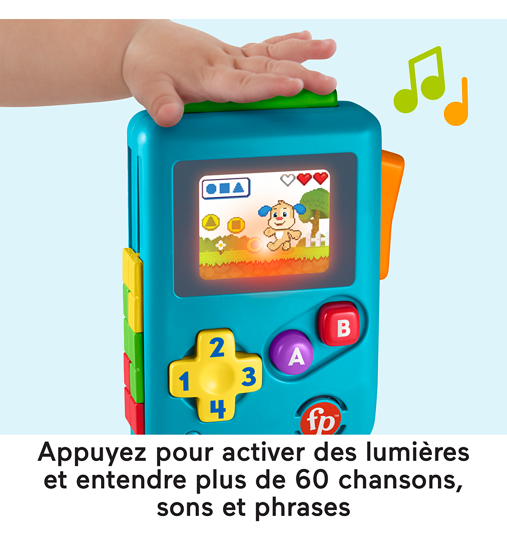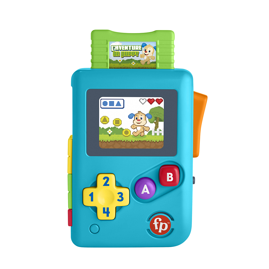 Ma première console de jeu Rires et Éveil® de Fisher-Price® est un jeu d’apprentissage interactif qui vous aidera à divertir votre tout-petit. Tout comme un vrai jeu vidéo, il comprend des flèches directionnelles, des boutons A et B et un écran qui s’allume, à la différence qu’il est parfaitement adapté aux petites mains, qui pourront appuyer et explorer à leur rythme. C’est un jouet éducatif qui comprend des chansons et phrases pour apprendre les directions, les couleurs, les chiffres et les formes à bébé.