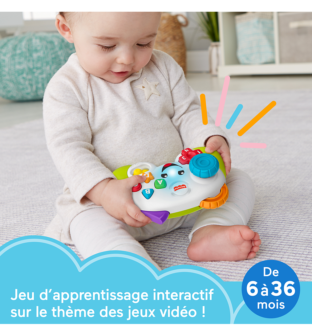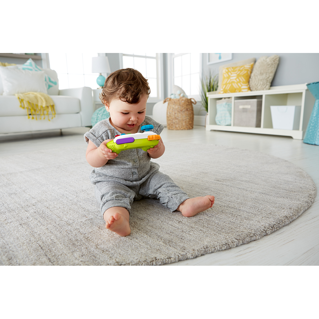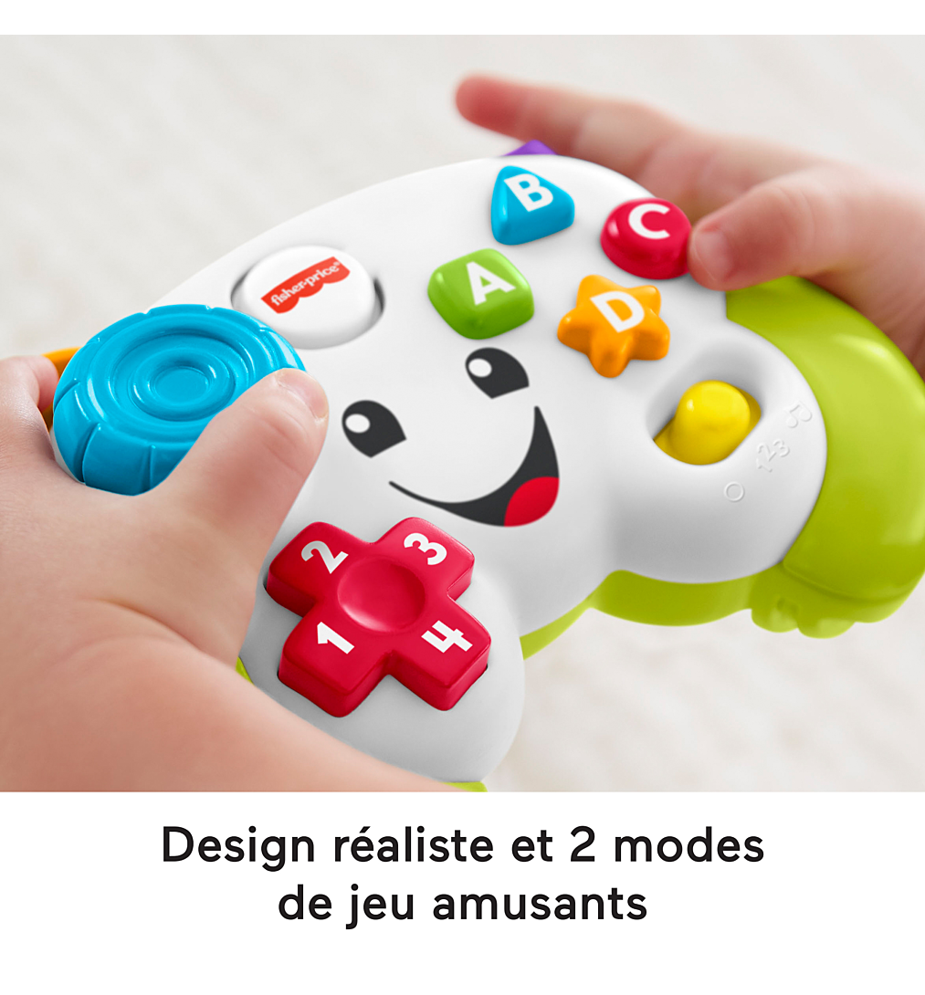 Les bébés et les tout-petits peuvent faire leurs premiers pas dans l’univers du jeu vidéo avec la Manette de Jeux et d’Apprentissages Rires et Éveil® de Fisher-Price®. Cette manette de jeu vidéo factice comprend deux modes de « jeu », des activités amusantes, ainsi que des chansons et des phrases qui initient bébé aux chiffres, aux formes, aux couleurs et plus encore pour qu’il continue à jouer et à apprendre. La conception réaliste de la manette inclut un joystick mobile, ainsi que des boutons ABCD et numérotés sur lesquels appuyer pour activer des lumières, de la musique et des sons.