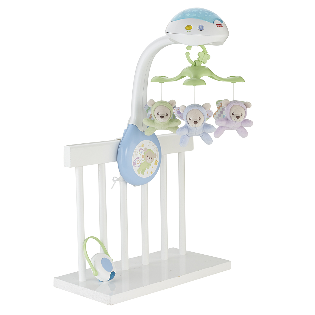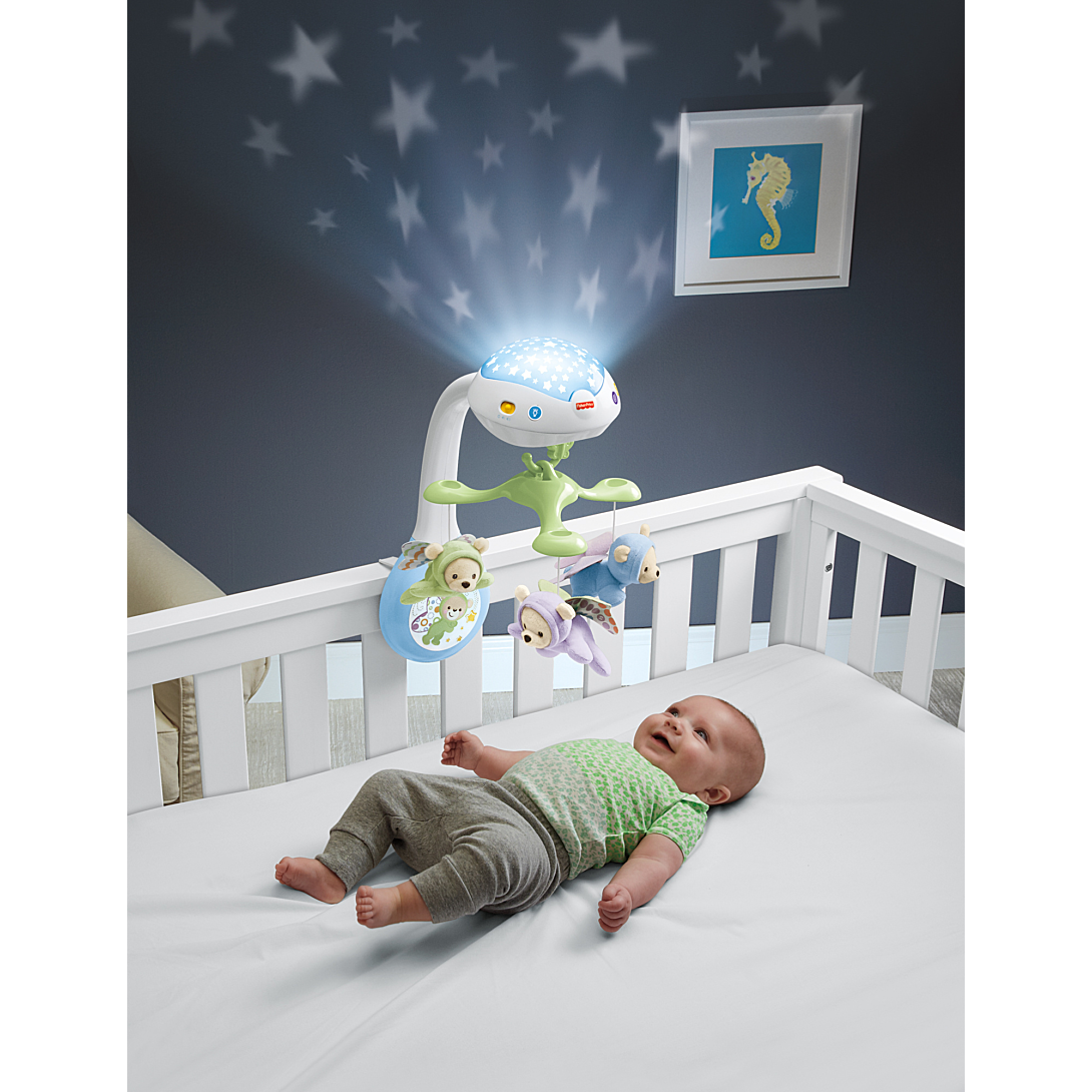 Plus produit Mobile motorisé transformable en veilleuse sonore, de nouveau-né à jeune enfant\nUtilisez le produit comme mobile (jusquà 5 mois), avec projection de lumières constellées sur le plafond et les murs. (Ce produit peut ne pas se fixer à tous les modèles de lits denfant.)\n3 modes musicaux et jusquà 30 minutes de berceuses, de sons de la nature ou de bruit blanc\nMobile amovible avec 3 jouets en tissu en forme de papillons. Se fixe facilement à la capote dune poussette pour lemporter partout\nInclut une télécommande avec mode veille intégré (pour réactiver le produit, appuyez sur nimporte quel bouton du mobile)