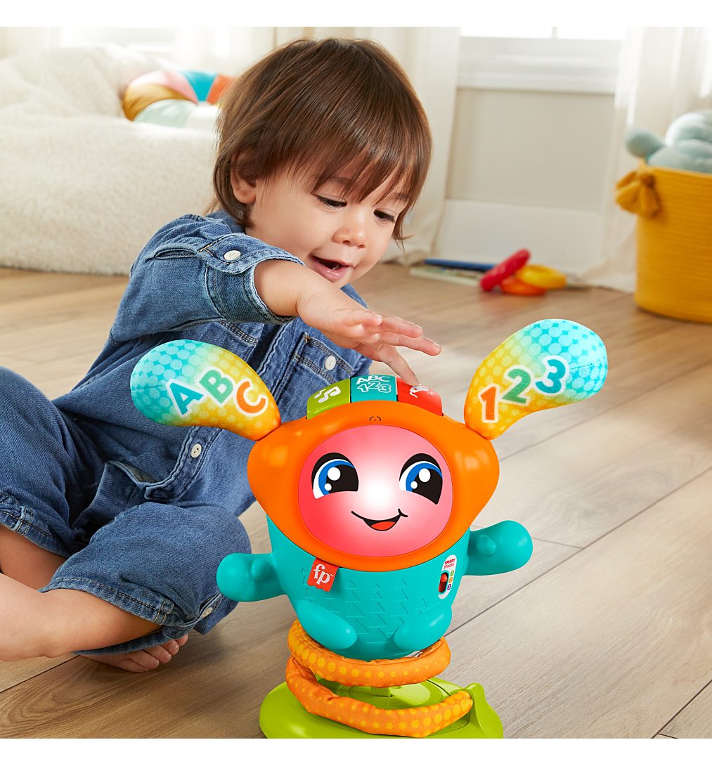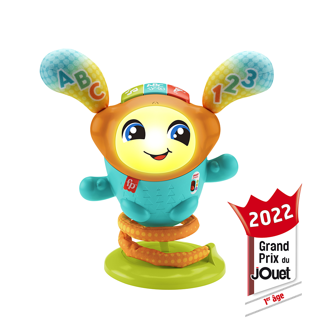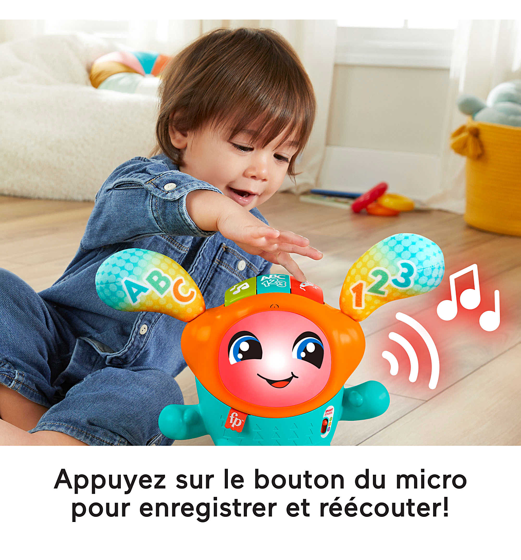 | Plus produit | Jouet déveil musical interactif avec base à ressorts pour un jeu plein danimation\n3 niveaux dapprentissage Éveil Progressif pour apprendre lalphabet, les couleurs, à compter de 1 à 10 et les opposés\nAppuyez sur les boutons déveil musicaux qui déclenchent plus de 75 chansons, sons et phrases, des lumières multicolores et un joyeux sautillement\nAppuyez sur le bouton micro pour enregistrer et écouter en profitant deffets sonores\nEncourage les enfants de 9 mois à 3 ans à danser, bouger et sauter |