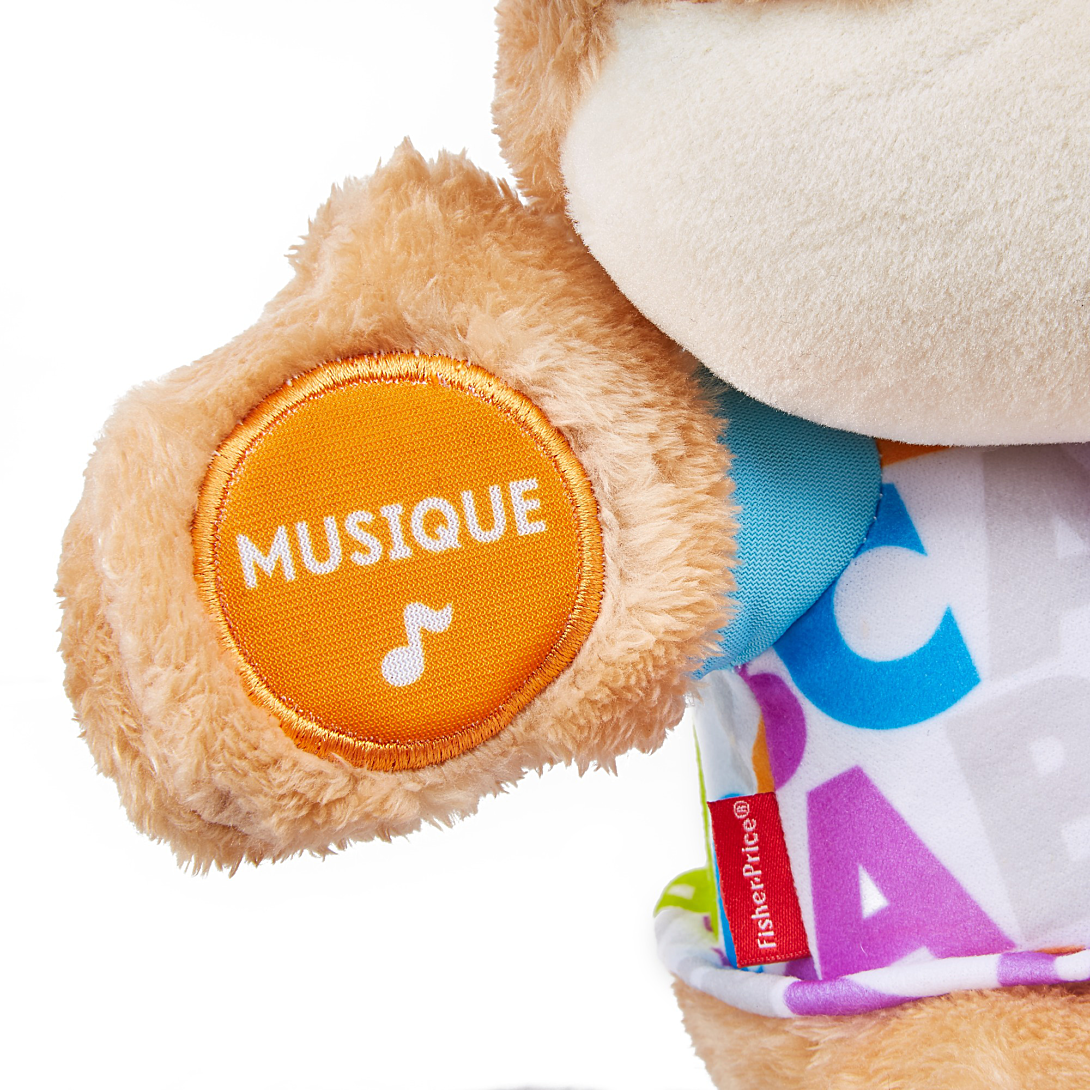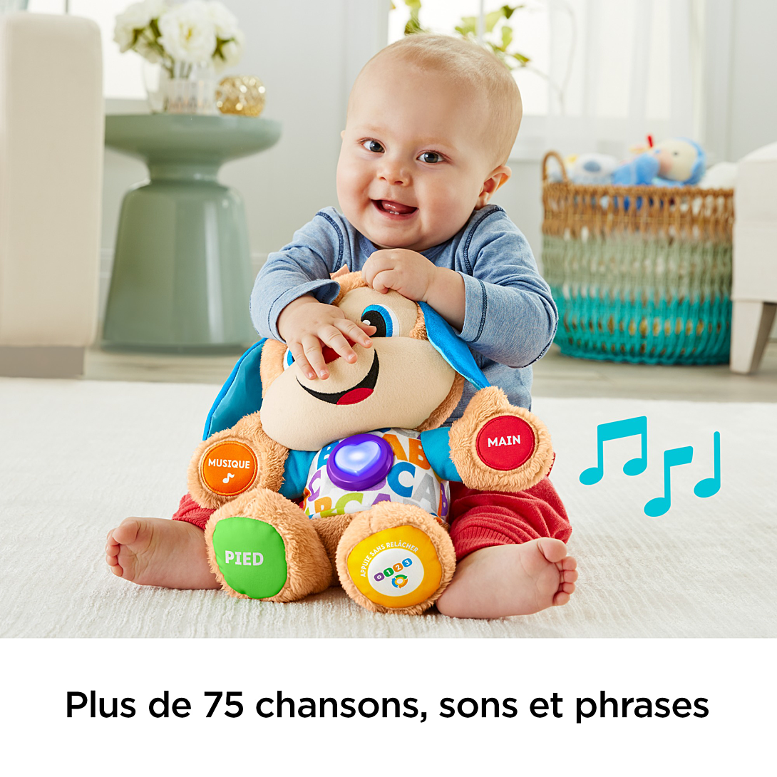 | Plus produit | Peluche à câliner qui apprendra à bébé plus de 100 mots et lui fera découvrir plus de 75 chansons, sons, mélodies et phrases\nLes mains, le pied, loreille et le cur lumineux de Puppy réagissent au toucher de bébé (5 points dactivation en tout !)\nLes 3 niveaux dapprentissage Éveil Progressif® font découvrir à bébé les parties du corps humain, les formes, lalphabet, le comptage et plus\nAppuyez longuement sur le cur lumineux de Puppy pour écouter toutes ses chansons\nPour bébés de 6 à 36 mois |