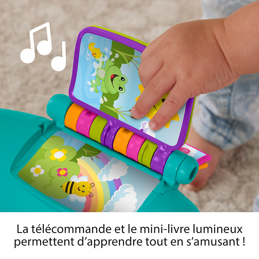 La Chaise Éveil Progressif Rires et Éveil de Fisher-Price est le jouet idéal pour s’installer confortablement, jouer et découvrir. Ce siège interactif détecte quand les enfants s’assoient ou se lèvent, et réagit avec des chansons et des phrases amusantes ! En prenant place sur la chaise, les bébés et les tout-petits peuvent découvrir de nombreuses activités amusantes, notamment une télécommande lumineuse avec des boutons de formes différentes et avec des chiffres, un mini livre et un coussin à soulever sous lequel se trouvent des surprises cachées. Les trois niveaux d’apprentissage Éveil Progressif comprennent plus de 120 chansons, sons et phrases qui initient les enfants aux couleurs, aux formes, aux chiffres, au calcul et aux contraires. Appuyez sur le bouton en forme de globe pour choisir la langue : anglais, allemand ou français. (Les couleurs et les décorations peuvent varier.)