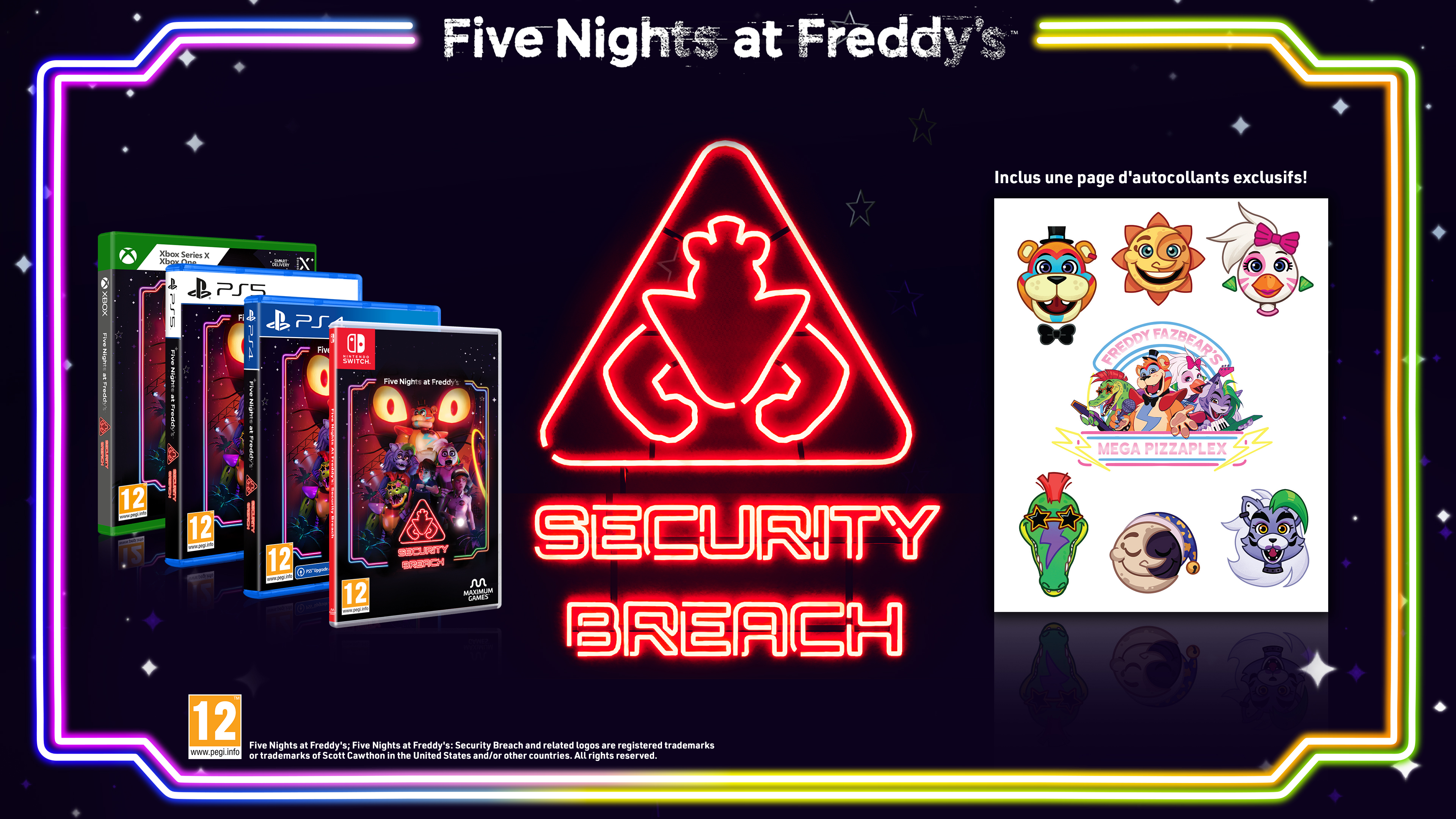 Plus-Produit : Les versions physiques de Five Nights at Freddy's : Security Breach comporteront une feuille d'autocollants en exclusivité ! Five Nights at Freddy's: Security Breach est le dernier volet de la franchise vidéoludique horrifique adulée par des millions de joueurs à travers le monde. Incarnez Gregory, un jeune homme coincé pour la nuit dans le Freddy Fazbear's Mega Pizzaplex. Avec l'aide de Freddy Fazbear en personne, Gregory doit survivre et échapper aux personnages de Five Nights at Freddy's (réinventés et rejoints par de toutes nouvelles menaces effroyables) qui le traquent sans relâche. LES CHASSEURS ET LEUR PROIE - Une fois les protocoles nocturnes engagés, les animatroniques de Freddy Fazbear's Mega Pizzaplex poursuivront inlassablement tout intrus. Glamrock Chica, Roxanne Wolf, Montgomery Gator et la vigile de Pizzaplex, Vanessa, retourneront tous les stands de pizza et de barbe à papa s'il le faut. Donc, mieux vaut ne pas rester trop longtemps au même endroit.