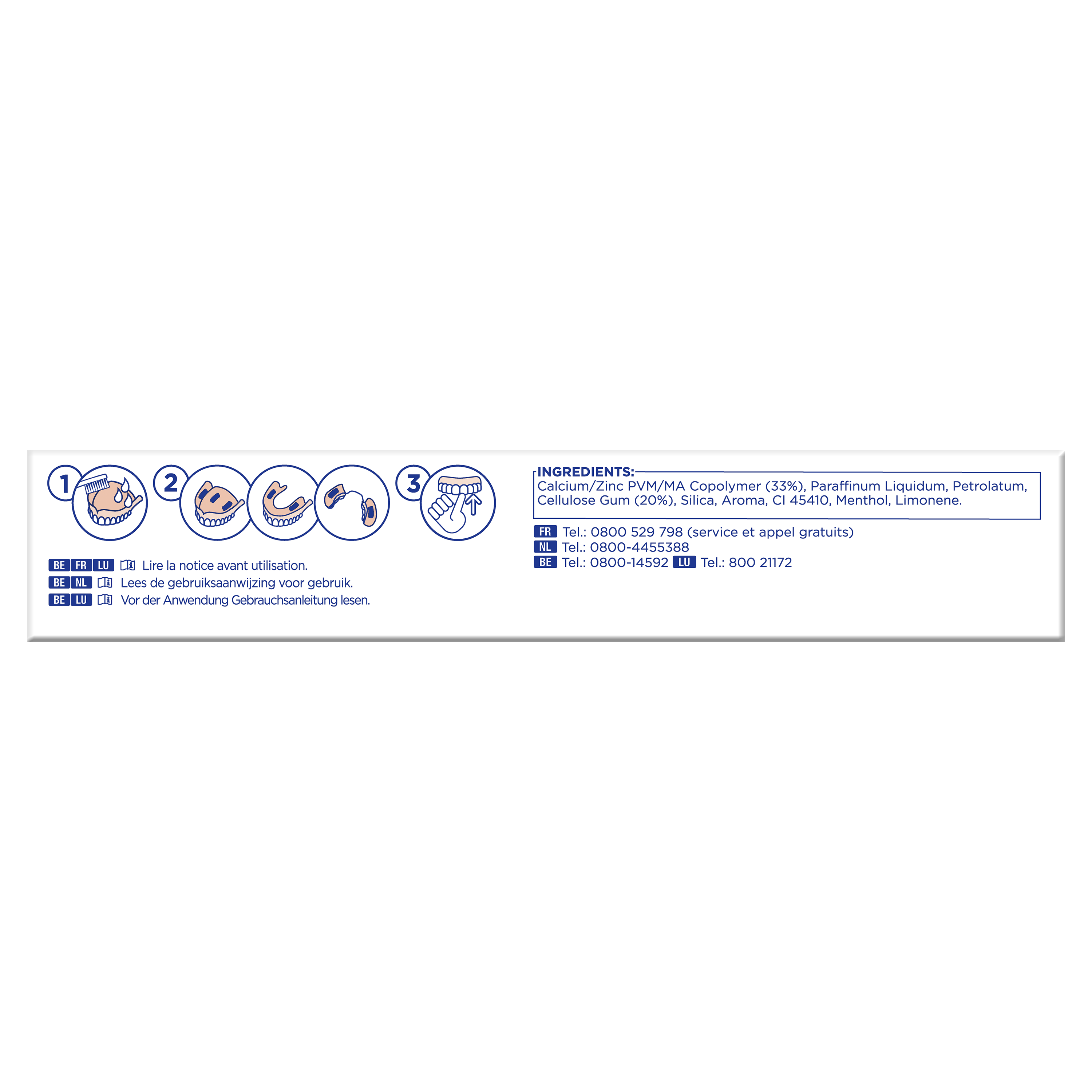 Consignes d’utilisation : 1. Nettoyez minutieusement votre prothèse dentaire et vos gencives. 2. Pour des résultats optimaux, appliquez des points de crème adhésive à intervalles réguliers sur les bords et la surface de la prothèse dentaire qui sont en contact avec votre bouche. 3. Rincez-vous la bouche avec de l’eau avant d’insérer votre prothèse dentaire. Notre crème adhésive pour prothèses dentaires est conçue pour réagir avec l’humidité afin de former une barrière fine et serrée contre les résidus alimentaires. 4. Positionnez la prothèse fermement et maintenez-la en place pendant un court moment. 5. Pour des résultats optimaux, attendez 15 à 30 minutes avant de manger ou boire.